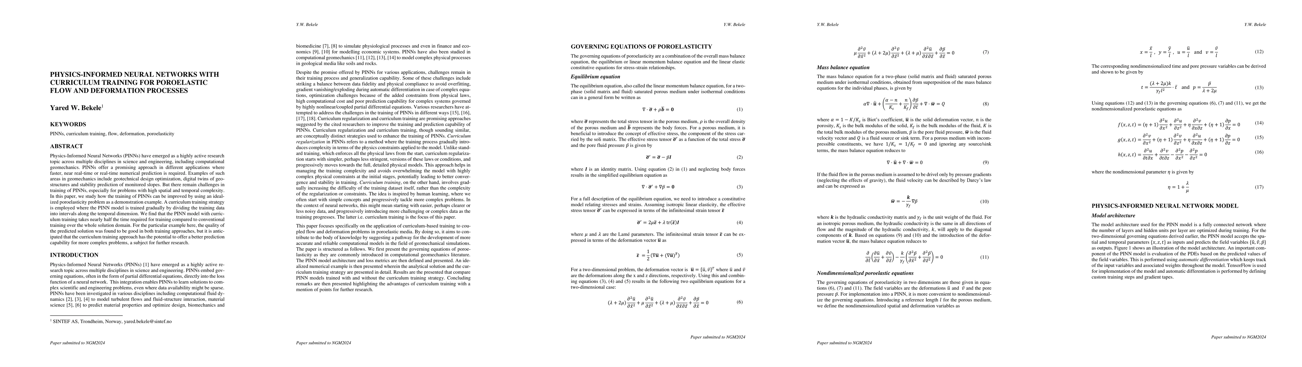 This paper explores the use of Physics-Informed Neural Networks (PINNs) with curriculum training for simulating poroelastic flow and deformation processes. The curriculum training strategy, which trains the model gradually over time intervals, significantly reduces training time by nearly half compared to conventional methods, though both methods yielded good prediction quality for the specific problem tested.