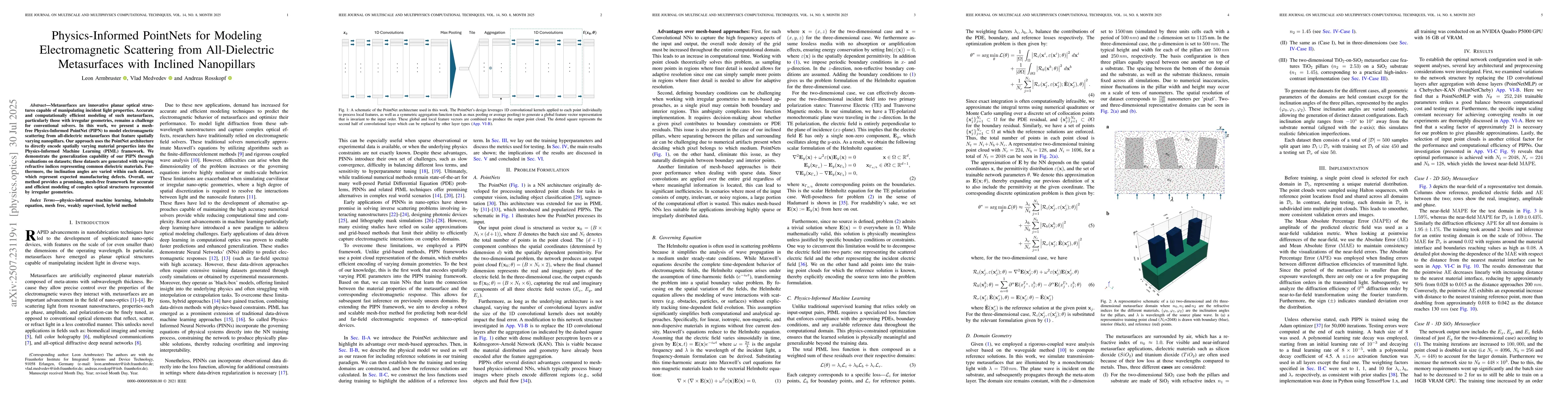 Metasurfaces are innovative planar optical structures capable of manipulating incident light properties. Accurate and computationally efficient modeling of such metasurfaces, particularly those with irregular geometries, remains a challenge for conventional solvers. In this work, we present a mesh-free Physics-Informed PointNet (PIPN) to model electromagnetic scattering from all-dielectric metasurfaces that feature spatially varying nanopillars. Our approach uses the PointNet architecture to directly encode spatially varying material properties into the Physics-Informed Machine Learning (PIML) framework. We demonstrate the generalization capability of our PIPN through evaluations on datasets; these datasets are generated with varying refractive indices representing common dielectric materials. Furthermore, the inclination angles are varied within each dataset, which represent expected manufacturing defects. Overall, our method provides a promising, mesh-free framework for accurate and efficient modeling of complex optical structures represented by irregular geometries.