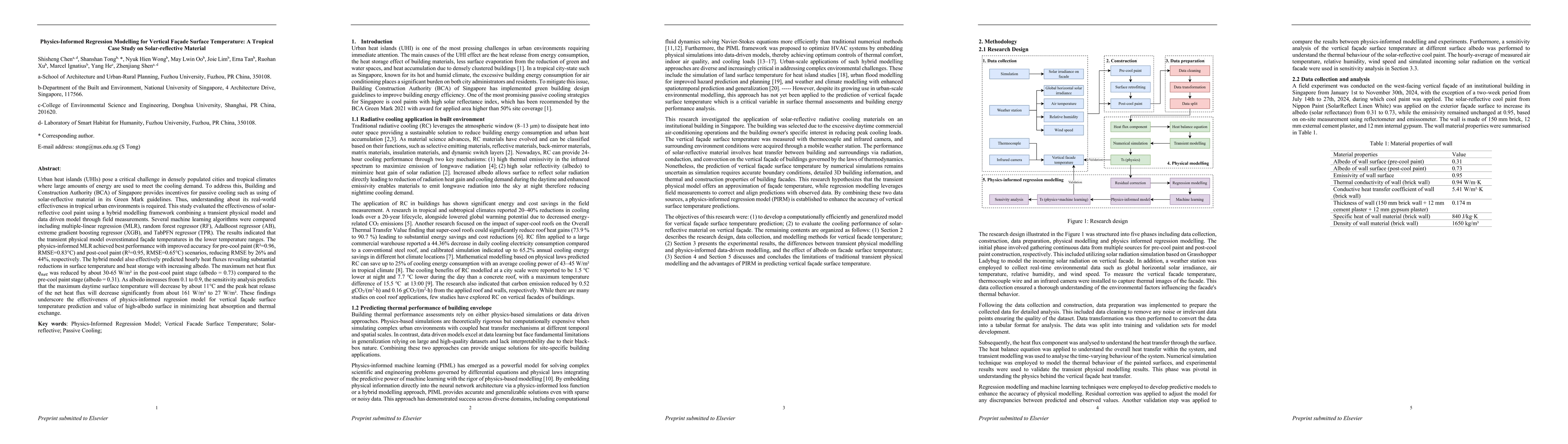 Urban heat islands (UHIs) pose a critical challenge in densely populated cities and tropical climates where large amounts of energy are used to meet the cooling demand. To address this, Building and Construction Authority (BCA) of Singapore provides incentives for passive cooling such as using of solar-reflective material in its Green Mark guidelines. Thus, understanding about its real-world effectiveness in tropical urban environments is required. This study evaluated the effectiveness of solar-reflective cool paint using a hybrid modelling framework combining a transient physical model and data driven model through field measurements. Several machine learning algorithms were compared including multiple-linear regression (MLR), random forest regressor (RF), AdaBoost regressor (AB), extreme gradient boosting regressor (XGB), and TabPFN regressor (TPR). The results indicated that the transient physical model overestimated facade temperatures in the lower temperature ranges. The physics-informed MLR achieved best performance with improved accuracy for pre-cool paint (R2=0.96, RMSE=0.83C) and post-cool paint (R2=0.95, RMSE=0.65C) scenarios, reducing RMSE by 26% and 44%, respectively. The hybrid model also effectively predicted hourly heat fluxes revealing substantial reductions in surface temperature and heat storage with increasing albedo. The maximum net heat flux q_net was reduced by about 30-65 W/m2 in the post-cool paint stage (albedo = 0.73) compared to the pre-cool paint stage (albedo = 0.31). As albedo increases from 0.1 to 0.9, the sensitivity analysis predicts that the maximum daytime surface temperature will decrease by about 11C and the peak heat release of the net heat flux will decrease significantly from about 161 W/m2 to 27 W/m2.
