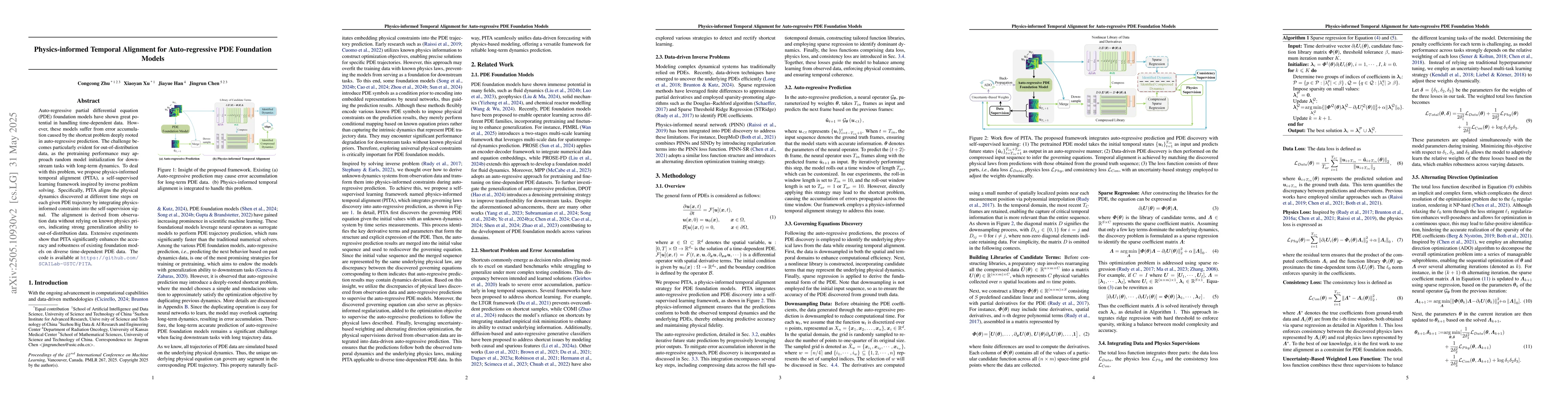 Auto-regressive partial differential equation (PDE) foundation models have shown great potential in handling time-dependent data. However, these models suffer from the shortcut problem deeply rooted in auto-regressive prediction, causing error accumulation. The challenge becomes particularly evident for out-of-distribution data, as the pretraining performance may approach random model initialization for downstream tasks with long-term dynamics. To deal with this problem, we propose physics-informed temporal alignment (PITA), a self-supervised learning framework inspired by inverse problem solving. Specifically, PITA aligns the physical dynamics discovered at different time steps on each given PDE trajectory by integrating physics-informed constraints into the self-supervision signal. The alignment is derived from observation data without relying on known physics priors, indicating strong generalization ability to the out-of-distribution data. Extensive experiments show that PITA significantly enhances the accuracy and robustness of existing foundation models on diverse time-dependent PDE data. The code is available at https://github.com/SCAILab-USTC/PITA.