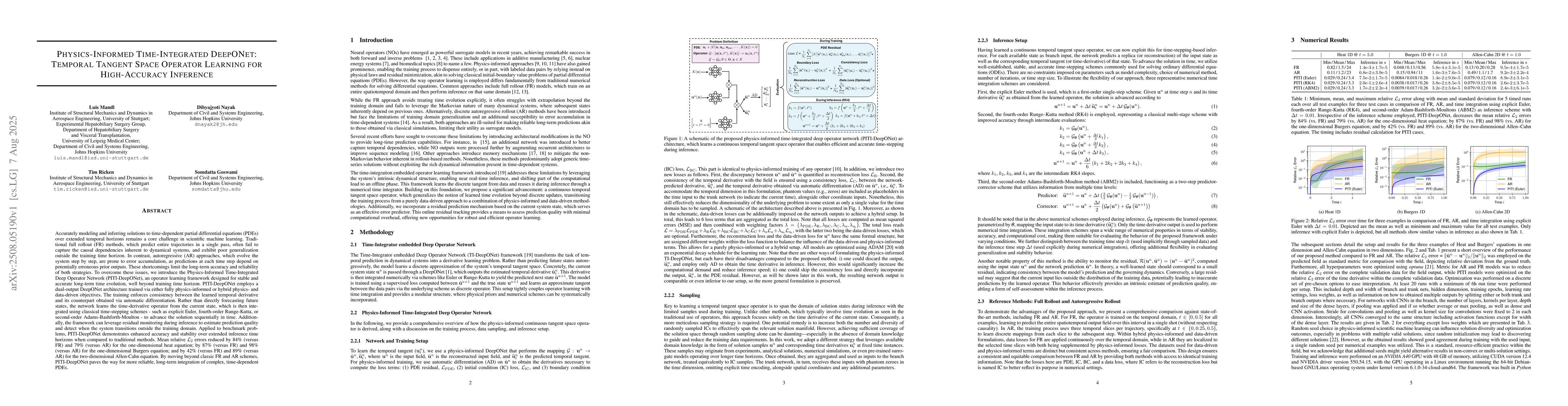 Accurately modeling and inferring solutions to time-dependent partial differential equations (PDEs) over extended horizons remains a core challenge in scientific machine learning. Traditional full rollout (FR) methods, which predict entire trajectories in one pass, often fail to capture the causal dependencies and generalize poorly outside the training time horizon. Autoregressive (AR) approaches, evolving the system step by step, suffer from error accumulation, limiting long-term accuracy. These shortcomings limit the long-term accuracy and reliability of both strategies. To address these issues, we introduce the Physics-Informed Time-Integrated Deep Operator Network (PITI-DeepONet), a dual-output architecture trained via fully physics-informed or hybrid physics- and data-driven objectives to ensure stable, accurate long-term evolution well beyond the training horizon. Instead of forecasting future states, the network learns the time-derivative operator from the current state, integrating it using classical time-stepping schemes to advance the solution in time. Additionally, the framework can leverage residual monitoring during inference to estimate prediction quality and detect when the system transitions outside the training domain. Applied to benchmark problems, PITI-DeepONet shows improved accuracy over extended inference time horizons when compared to traditional methods. Mean relative $\mathcal{L}_2$ errors reduced by 84% (vs. FR) and 79% (vs. AR) for the one-dimensional heat equation; by 87% (vs. FR) and 98% (vs. AR) for the one-dimensional Burgers equation; and by 42% (vs. FR) and 89% (vs. AR) for the two-dimensional Allen-Cahn equation. By moving beyond classic FR and AR schemes, PITI-DeepONet paves the way for more reliable, long-term integration of complex, time-dependent PDEs.