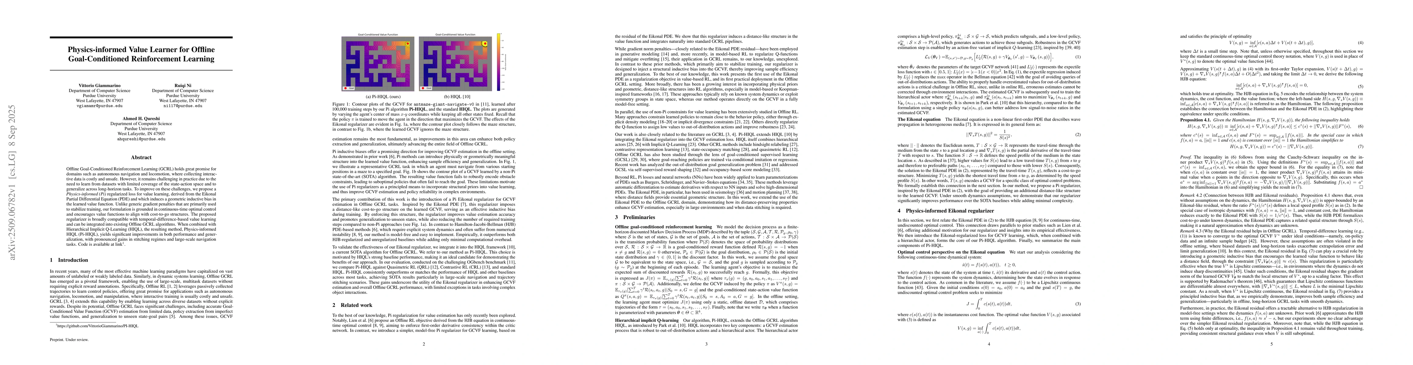 Offline Goal-Conditioned Reinforcement Learning (GCRL) holds great promise for domains such as autonomous navigation and locomotion, where collecting interactive data is costly and unsafe. However, it remains challenging in practice due to the need to learn from datasets with limited coverage of the state-action space and to generalize across long-horizon tasks. To improve on these challenges, we propose a Physics-informed (Pi) regularized loss for value learning, derived from the Eikonal Partial Differential Equation (PDE) and which induces a geometric inductive bias in the learned value function. Unlike generic gradient penalties that are primarily used to stabilize training, our formulation is grounded in continuous-time optimal control and encourages value functions to align with cost-to-go structures. The proposed regularizer is broadly compatible with temporal-difference-based value learning and can be integrated into existing Offline GCRL algorithms. When combined with Hierarchical Implicit Q-Learning (HIQL), the resulting method, Physics-informed HIQL (Pi-HIQL), yields significant improvements in both performance and generalization, with pronounced gains in stitching regimes and large-scale navigation tasks.