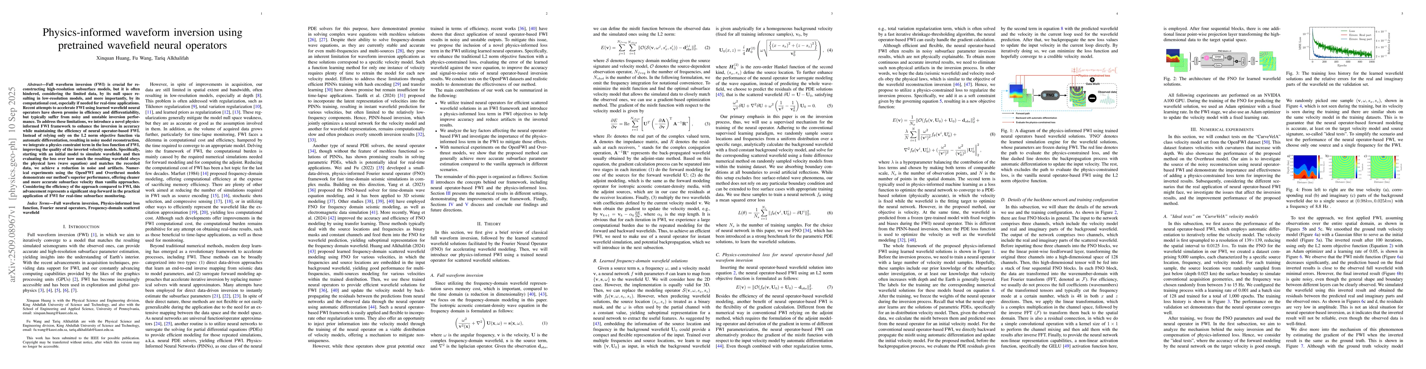 Full waveform inversion (FWI) is crucial for reconstructing high-resolution subsurface models, but it is often hindered, considering the limited data, by its null space resulting in low-resolution models, and more importantly, by its computational cost, especially if needed for real-time applications. Recent attempts to accelerate FWI using learned wavefield neural operators have shown promise in efficiency and differentiability, but typically suffer from noisy and unstable inversion performance. To address these limitations, we introduce a novel physics-informed FWI framework to enhance the inversion in accuracy while maintaining the efficiency of neural operator-based FWI. Instead of relying only on the L2 norm objective function via automatic differentiation, resulting in noisy model reconstruction, we integrate a physics constraint term in the loss function of FWI, improving the quality of the inverted velocity models. Specifically, starting with an initial model to simulate wavefields and then evaluating the loss over how much the resulting wavefield obeys the physical laws (wave equation) and matches the recorded data, we achieve a reduction in noise and artifacts. Numerical experiments using the OpenFWI and Overthrust models demonstrate our method's superior performance, offering cleaner and more accurate subsurface velocity than vanilla approaches. Considering the efficiency of the approach compared to FWI, this advancement represents a significant step forward in the practical application of FWI for real-time subsurface monitoring.