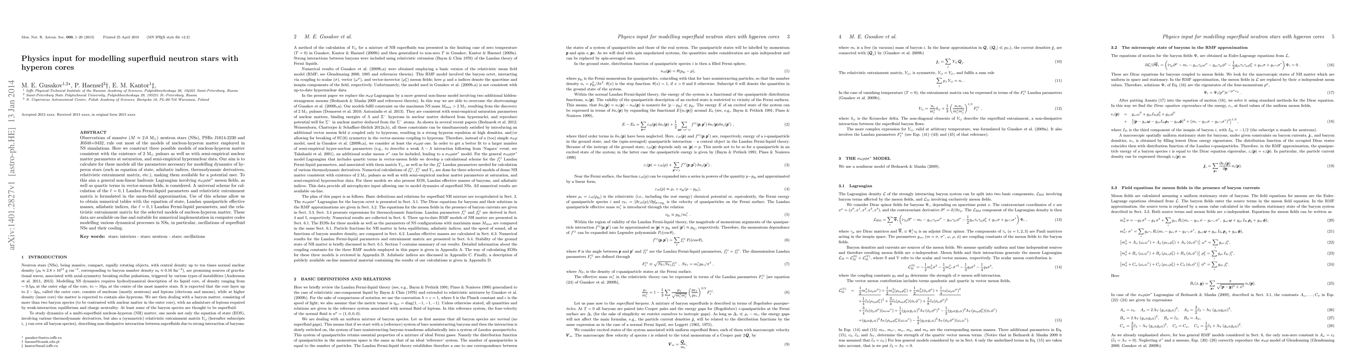 Observations of massive ($M \approx 2.0~M_\odot$) neutron stars (NSs), PSRs J1614-2230 and J0348+0432, rule out most of the models of nucleon-hyperon matter employed in NS simulations. Here we construct three possible models of nucleon-hyperon matter consistent with the existence of $2~M_\odot$ pulsars as well as with semi-empirical nuclear matter parameters at saturation, and semi-empirical hypernuclear data. Our aim is to calculate for these models all the parameters necessary for modelling dynamics of hyperon stars (such as equation of state, adiabatic indices, thermodynamic derivatives, relativistic entrainment matrix, etc.), making them available for a potential user. To this aim a general non-linear hadronic Lagrangian involving $\sigma\omega\rho\phi\sigma^\ast$ meson fields, as well as quartic terms in vector-meson fields, is considered. A universal scheme for calculation of the $\ell=0,1$ Landau Fermi-liquid parameters and relativistic entrainment matrix is formulated in the mean-field approximation. Use of this scheme allow us to obtain numerical tables with the equation of state, Landau quasiparticle effective masses, adiabatic indices, the $\ell=0,1$ Landau Fermi-liquid parameters, and the relativistic entrainment matrix for the selected models of nucleon-hyperon matter. These data are available on-line and suitable for numerical implementation in computer codes modelling various dynamical processes in NSs, in particular, oscillations of superfluid NSs and their cooling.