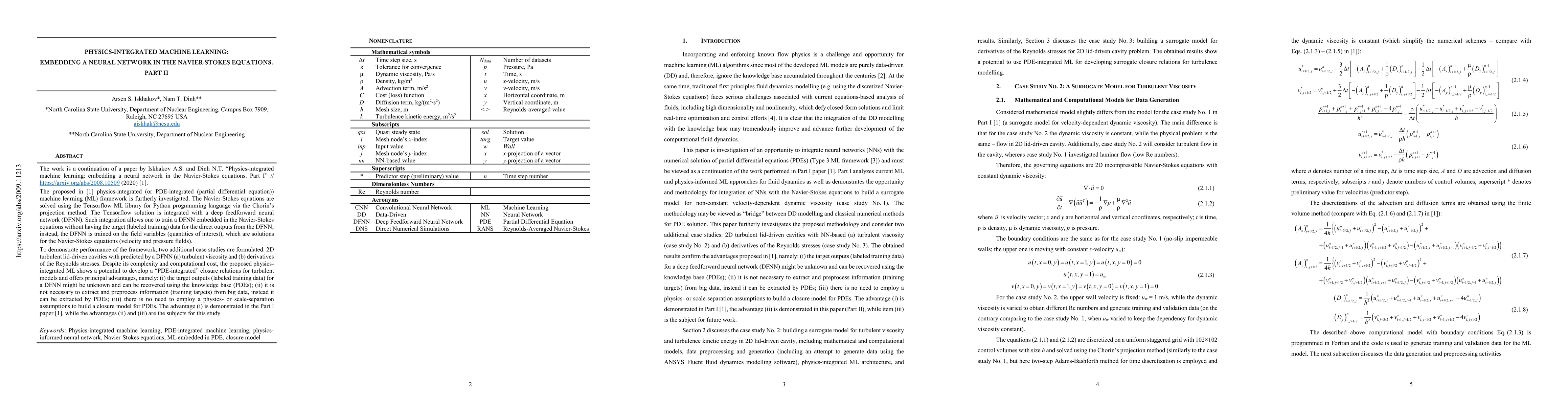 This paper explores a physics-integrated machine learning framework that embeds a deep feedforward neural network in the Navier-Stokes equations, leveraging TensorFlow for solution. The neural network is trained on field variables derived from the equations, demonstrating potential for developing PDE-integrated closure relations for turbulent models without requiring labeled training data.
