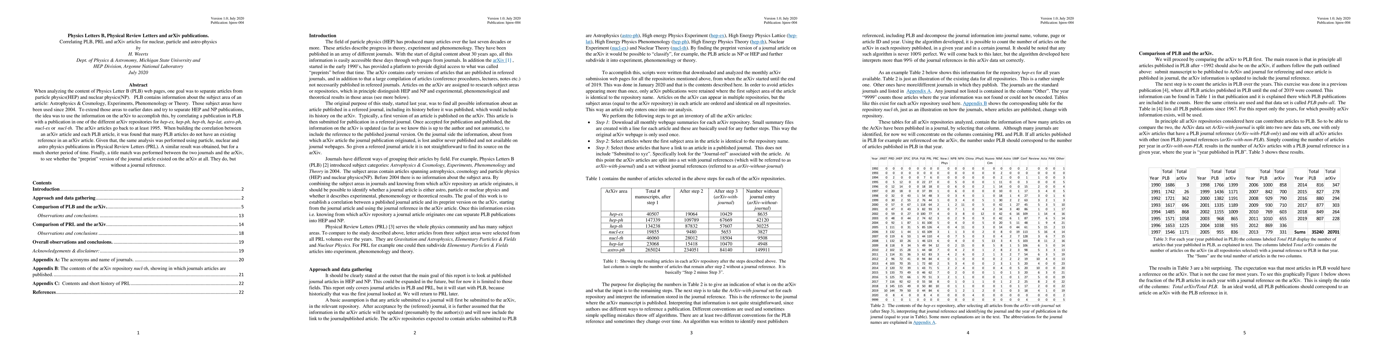 When analyzing the content of Physics Letter B (PLB) web pages, one goal was to separate articles from particle physics(HEP) and nuclear physics(NP). PLB contains information about the subject area of an article: Astrophysics and Cosmology, Experiments, Phenomenology or Theory. Those subject areas have been used since 2004. To extend those areas to earlier dates and try to separate HEP and NP publications, the idea was to use the information on the arXiv to accomplish this, by correlating a publication in PLB with a publication in one of the different arXiv repositories for particle, nuclear or astrophysics. The arXiv articles go back to at least 1995. When building the correlation between an arXiv article and each PLB article, it was found that many PLB articles do not have an existing reference in an arXiv article. Given that, the same analysis was performed using particle, nuclear and astro physics publications in Physical Review Letters (PRL). A similar result was obtained, but for a much shorter period of time. Finally, a title match was performed between the two journals and the arXiv, to see whether the preprint version of the journal article existed on the arXiv at all. They do, but without a journal reference.