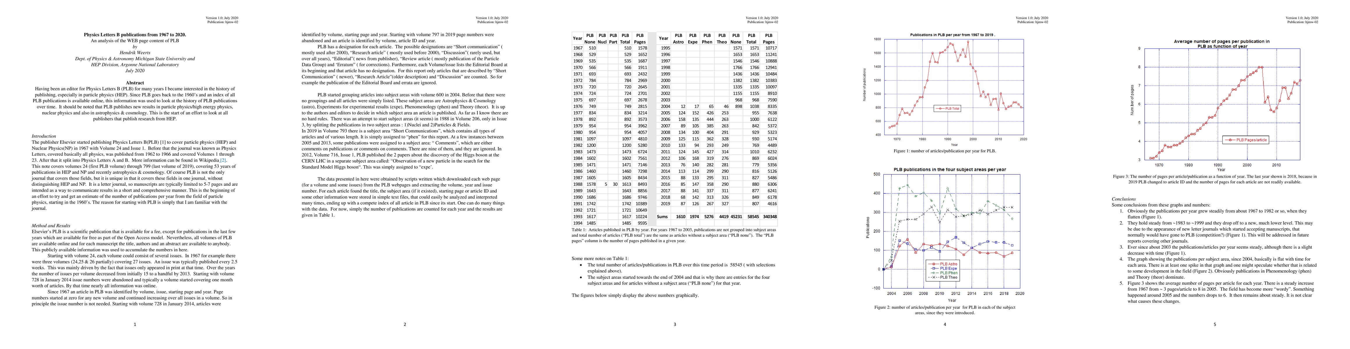 Having been an editor for Physics Letters B (PLB) for many years I became interested in the history of publishing, especially in particle physics (HEP). Since PLB goes back to 1967 and an index of all PLB publications is available online, this information was used to look at the history of PLB publications over time. It should be noted that PLB publishes new results in particle physics or high energy physics, nuclear physics and also in astrophysics and cosmology. This is the start of an effort to look at all publishers that publish research from HEP.