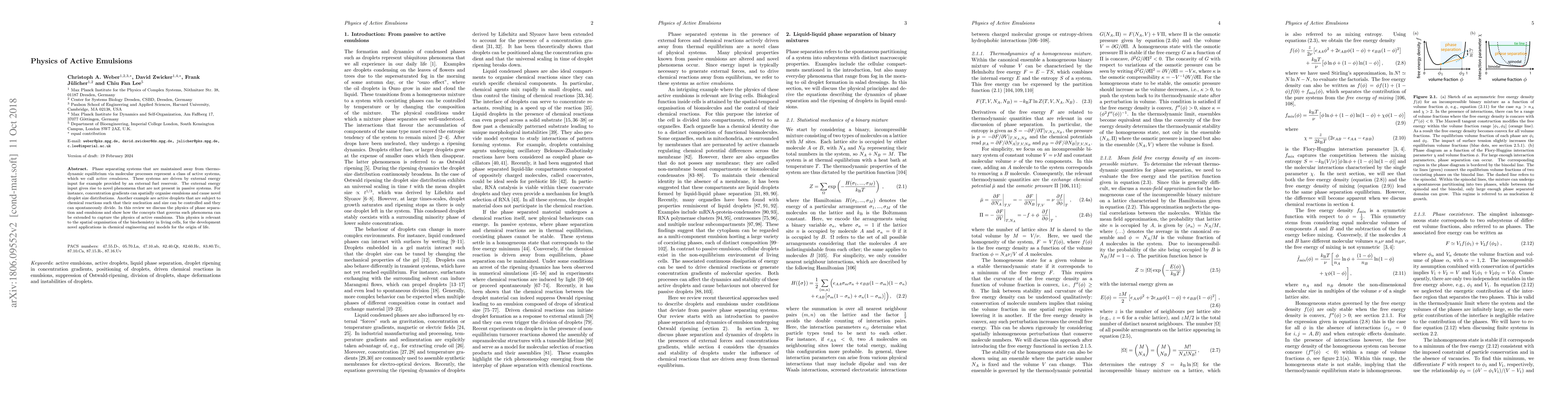 This paper reviews the physics of active emulsions, systems that maintain phase separation through external energy input, leading to novel phenomena like spatially organized droplet size distributions and self-dividing active droplets. The study extends traditional physics concepts to understand these systems, which have implications for biochemistry, chemical engineering, and the origin of life.
