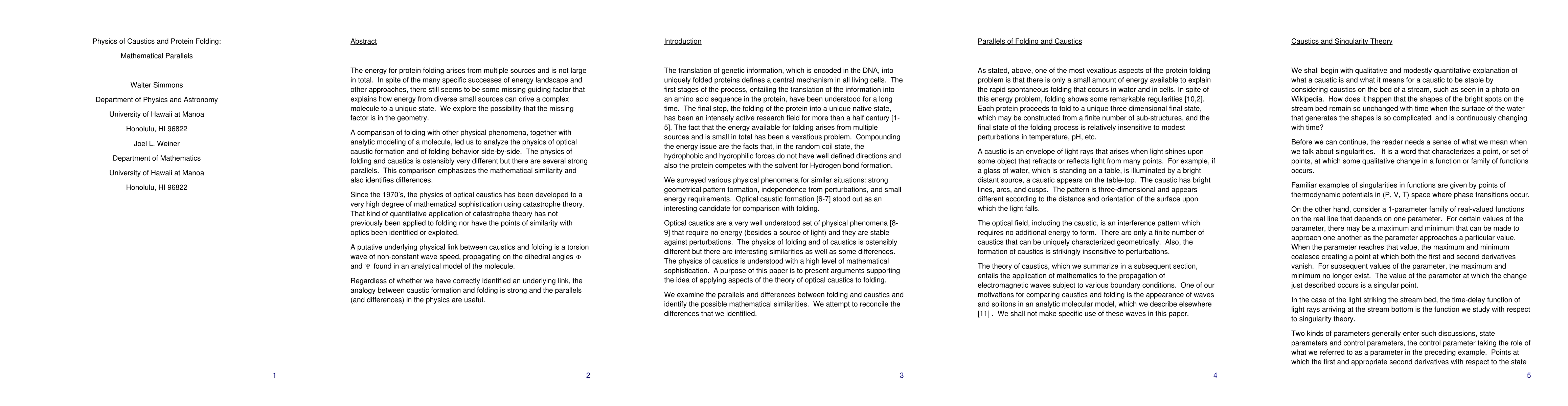 The energy for protein folding arises from multiple sources and is not large in total. In spite of the many specific successes of energy landscape and other approaches, there still seems to be some missing guiding factor that explains how energy from diverse small sources can drive a complex molecule to a unique state. We explore the possibility that the missing factor is in the geometry. A comparison of folding with other physical phenomena, together with analytic modeling of a molecule, led us to analyze the physics of optical caustic formation and of folding behavior side-by-side. The physics of folding and caustics is ostensibly very different but there are several strong parallels. This comparison emphasizes the mathematical similarity and also identifies differences. Since the 1970's, the physics of optical caustics has been developed to a very high degree of mathematical sophistication using catastrophe theory. That kind of quantitative application of catastrophe theory has not previously been applied to folding nor have the points of similarity with optics been identified or exploited. A putative underlying physical link between caustics and folding is a torsion wave of non-constant wave speed, propagating on the dihedral angles and $\Psi$ found in an analytical model of the molecule. Regardless of whether we have correctly identified an underlying link, the analogy between caustic formation and folding is strong and the parallels (and differences) in the physics are useful.