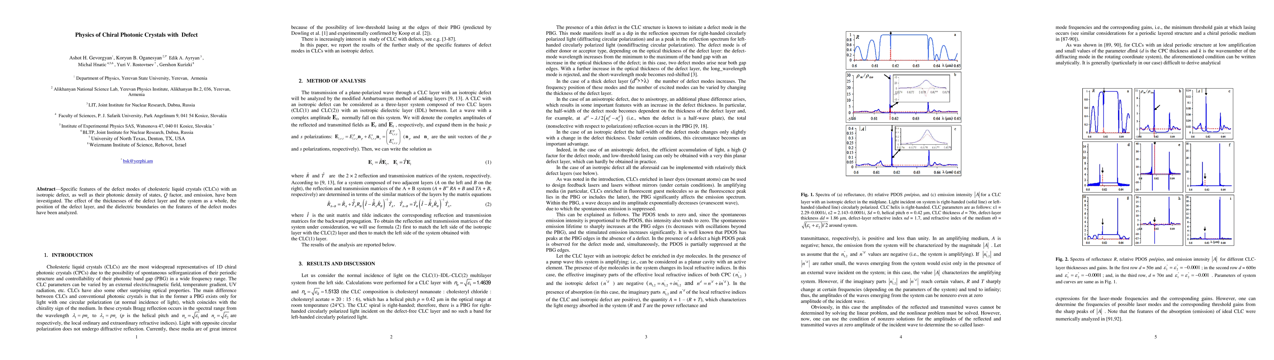 Specific features of the defect modes of cholesteric liquid crystals (CLCs) with an isotropic defect, as well as their photonic density of states, Q factor, and emission, have been investigated. The effect of the thicknesses of the defect layer and the system as a whole, the position of the defect layer, and the dielectric boundaries on the features of the defect modes have been analyzed.