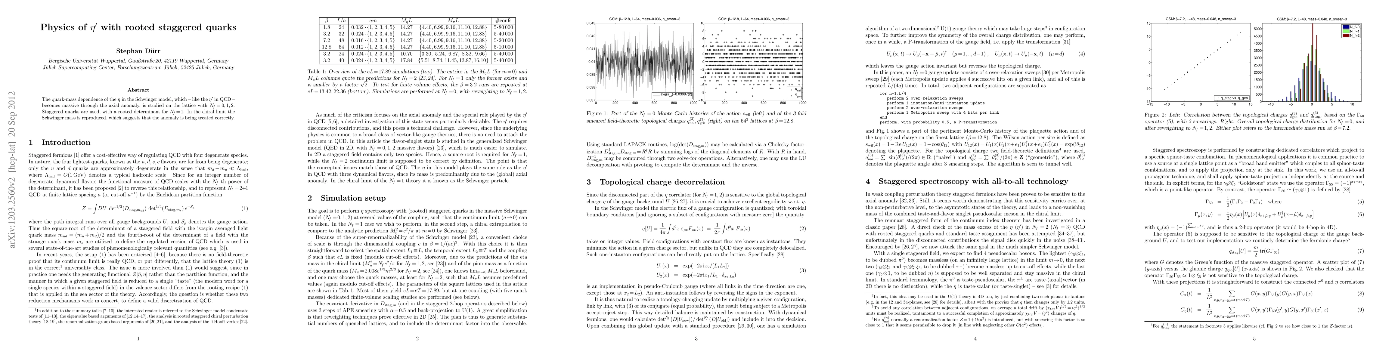 This paper investigates the quark-mass dependence of the eta particle in the Schwinger model using lattice simulations with staggered quarks and a rooted determinant. The results in the chiral limit match the Schwinger mass, indicating a correct treatment of the axial anomaly.