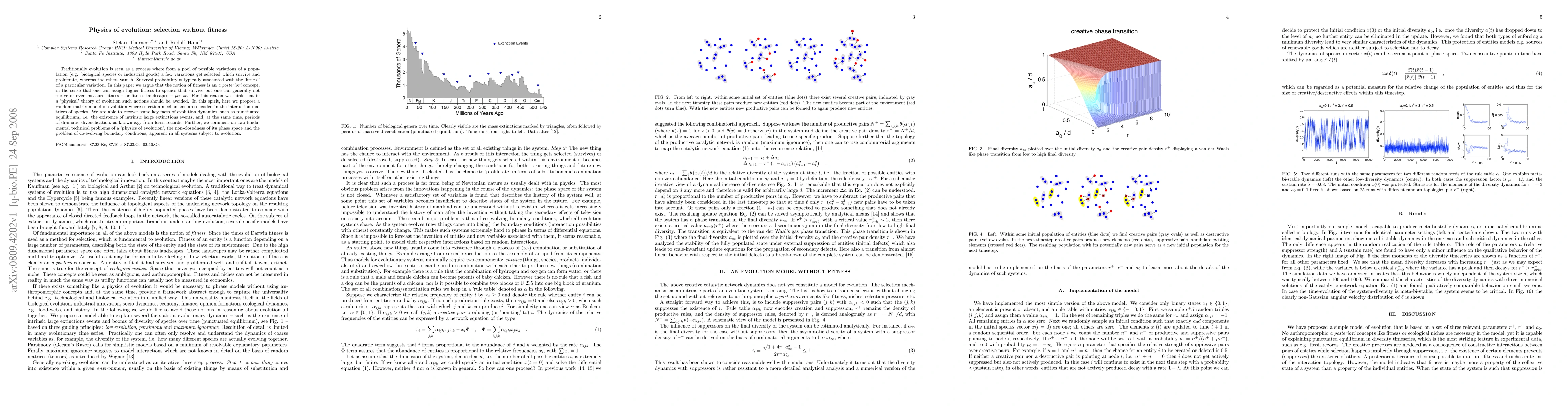 Traditionally evolution is seen as a process where from a pool of possible variations of a population (e.g. biological species or industrial goods) a few variations get selected which survive and proliferate, whereas the others vanish. Survival probability is typically associated with the 'fitness' of a particular variation. In this paper we argue that the notion of fitness is an a posteriori concept, in the sense that one can assign higher fitness to species that survive but one can generally not derive or even measure fitness - or fitness landscapes - per se. For this reason we think that in a 'physical' theory of evolution such notions should be avoided. In this spirit, here we propose a random matrix model of evolution where selection mechanisms are encoded in the interaction matrices of species. We are able to recover some key facts of evolution dynamics, such as punctuated equilibrium, i.e. the existence of intrinsic large extinctions events, and, at the same time, periods of dramatic diversification, as known e.g. from fossil records. Further, we comment on two fundamental technical problems of a 'physics of evolution', the non-closedness of its phase space and the problem of co-evolving boundary conditions, apparent in all systems subject to evolution.