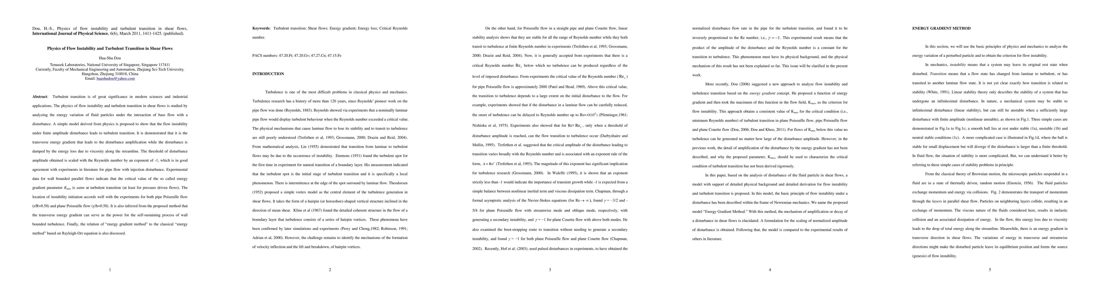 In this paper, the physics of flow instability and turbulent transition in shear flows is studied by analyzing the energy variation of fluid particles under the interaction of base flow with a disturbance. For the first time, a model derived strictly from physics is proposed to show that the flow instability under finite amplitude disturbance leads to turbulent transition. The proposed model is named as "energy gradient method." It is demonstrated that it is the transverse energy gradient that leads to the disturbance amplification while the disturbance is damped by the energy loss due to viscosity along the streamline. It is also shown that the threshold of disturbance amplitude obtained is scaled with the Reynolds number by an exponent of -1, which exactly explains the recent modern experimental results by Hof et al. for pipe flow. The mechanism for velocity inflection and hairpin vortex formation are explained with reference to analytical results. Following from this analysis, it can be demonstrated that the critical value of the so called energy gradient parameter Kmax is constant for turbulent transition in wall bounded parallel flows, and this is confirmed by experiments and is about 370-389. The location of instability initiation in the flow field accords well with the experiments for both pipe Poiseuille flow (r/R=0.58) and plane Poiseuille flow (y/h=0.58). It is also inferred from the proposed method that the transverse energy gradient can serve as the power for the self-sustaining process of wall bounded turbulence. Finally, the relation of "energy gradient method" to the classical "energy method" based on Rayleigh-Orr equation is discussed.