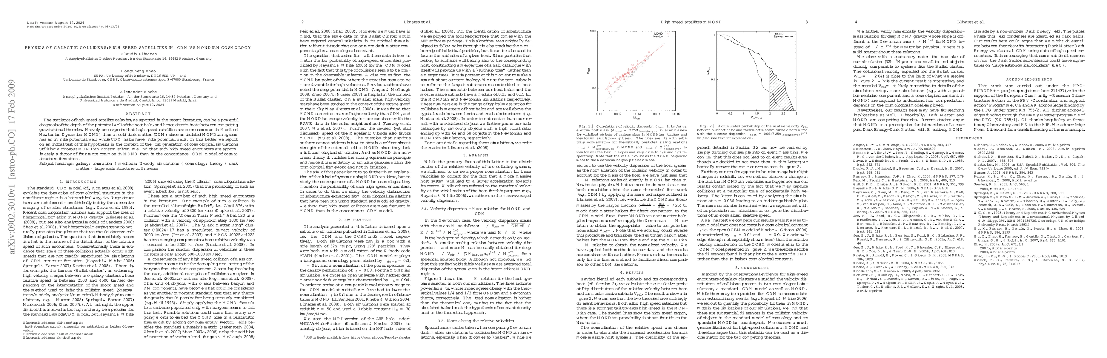 The statistics of high speed satellite galaxies, as reported in the recent literature, can be a powerful diagnosis of the depth of the potential well of the host halo, and hence discriminate between competing gravitational theories. Naively one expects that high speed satellites are more common in Modified Newtonian Dynamics (MOND) than in cold dark matter (CDM) since an isolated MONDian system has an infinite potential well, while CDM halos have finite potential wells. In this \textit{Letter} we report on an initial test of this hypothesis in the context of the first generation of cosmological simulations utilising a rigorous MONDian Poisson solver. We find that such high speed encounters are approximately a factor of four more common in MOND than in the concordance $\Lambda$CDM model of cosmic structure formation.