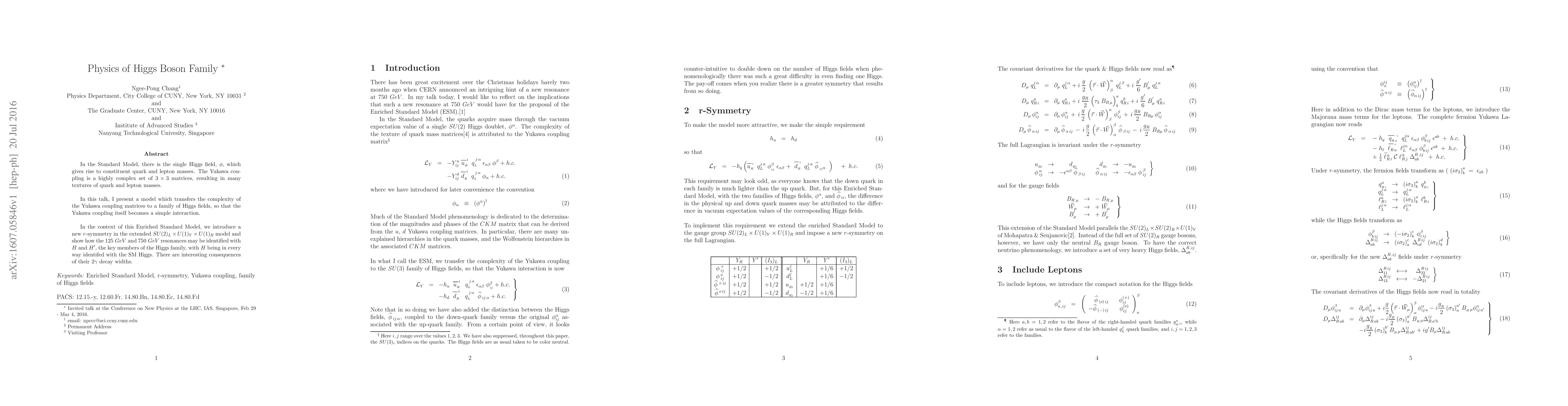 In the Standard Model, there is the single Higgs field, $\phi$, which gives rise to constituent quark and lepton masses. The Yukawa coupling is a highly complex set of $3 \times 3$ matrices, resulting in many textures of quark and lepton masses. In this talk, I present a model which transfers the complexity of the Yukawa coupling matrices to a family of Higgs fields, so that the Yukawa coupling itself becomes a simple interaction. In the context of this Enriched Standard Model, we introduce a new $r$-symmetry in the extended $SU(2)_L \times U(1)_Y \times U(1)_R$ model and show how the $125 \;GeV$ and $750 \;GeV$ resonances may be identified with $H$ and $H'$, the key members of the Higgs family, with $H$ being in every way identifed with the SM Higgs. There are interesting consequences of their $2 \gamma$ decay widths.