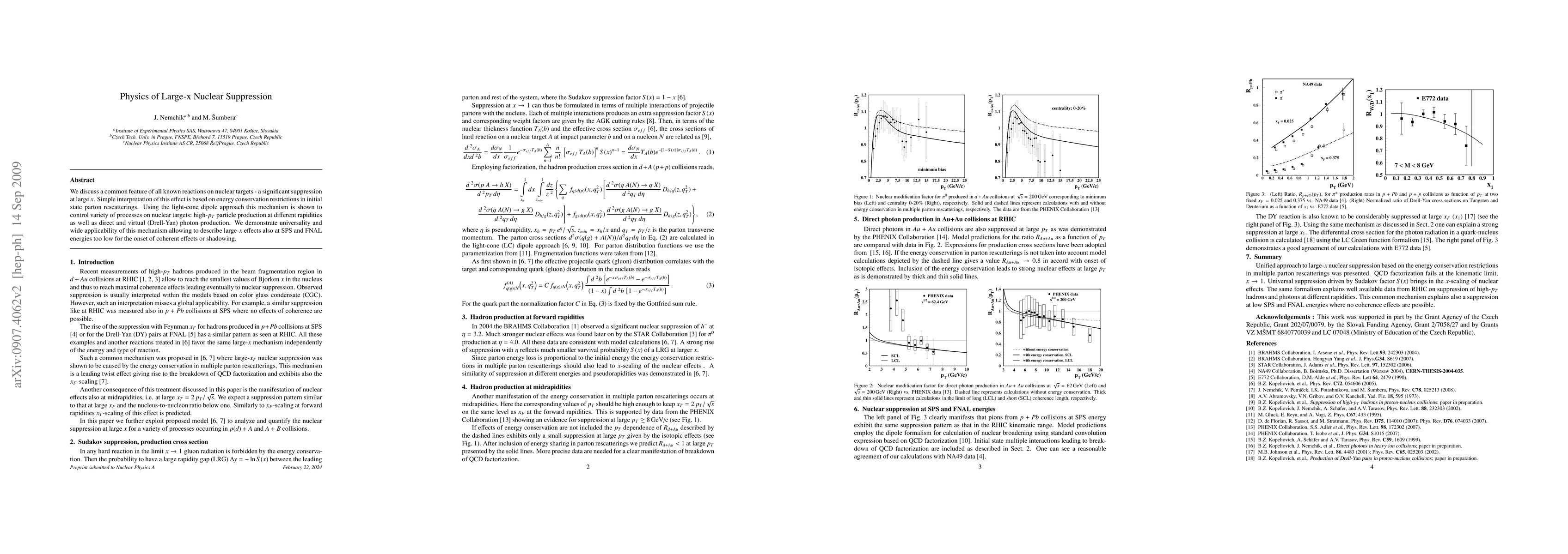 We discuss a common feature of all known reactions on nuclear targets - a significant suppression at large x. Simple interpretation of this effect is based on energy conservation restrictions in initial state parton rescatterings. Using the light-cone dipole approach this mechanism is shown to control variety of processes on nuclear targets: high-pT particle production at different rapidities as well as direct and virtual (Drell-Yan) photon production. We demonstrate universality and wide applicability of this mechanism allowing to describe large-x effects also at SPS and FNAL energies too low for the onset of coherent effects or shadowing.