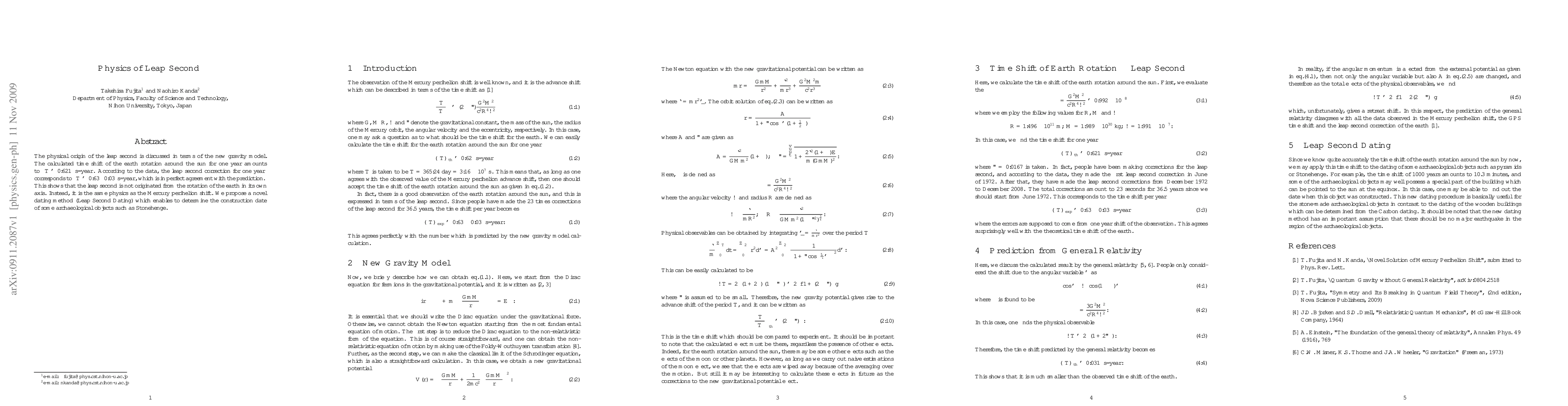 The physical origin of the leap second is discussed in terms of the new gravity model. The calculated time shift of the earth rotation around the sun for one year amounts to $\displaystyle{\Delta T \simeq 0.621 s/ year}$. According to the data, the leap second correction for one year corresponds to $\Delta T \simeq 0.63 \pm 0.03 s/ year $, which is in perfect agreement with the prediction. This shows that the leap second is not originated from the rotation of the earth in its own axis. Instead, it is the same physics as the Mercury perihelion shift. We propose a novel dating method (Leap Second Dating) which enables to determine the construction date of some archaeological objects such as Stonehenge.