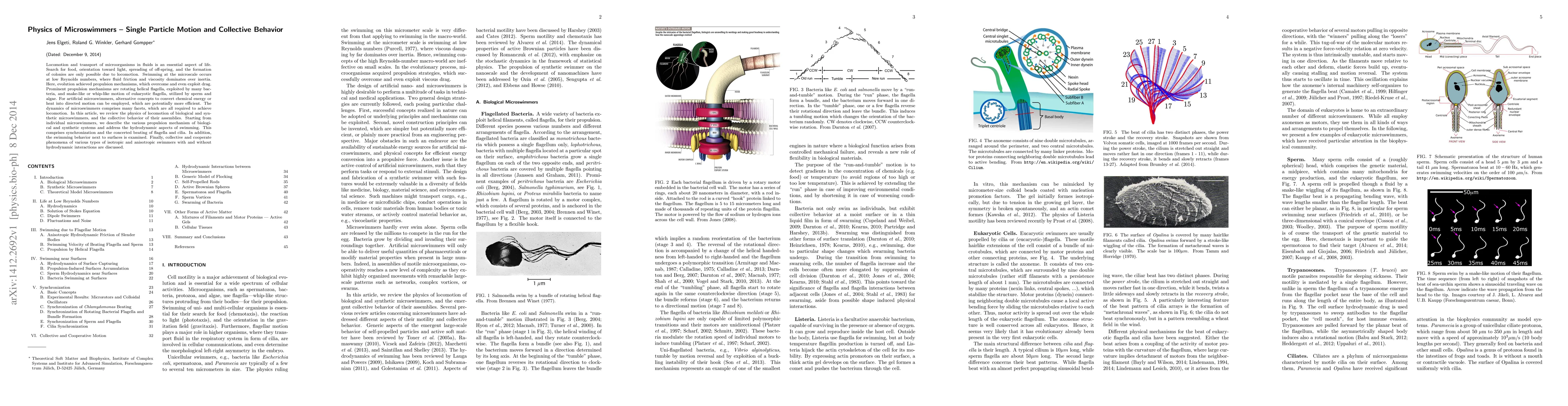 This paper reviews the physics of microswimmers, focusing on the locomotion mechanisms of biological and synthetic microorganisms, including flagella and cilia propulsion, and examines their collective behavior, including hydrodynamic interactions and synchronization.