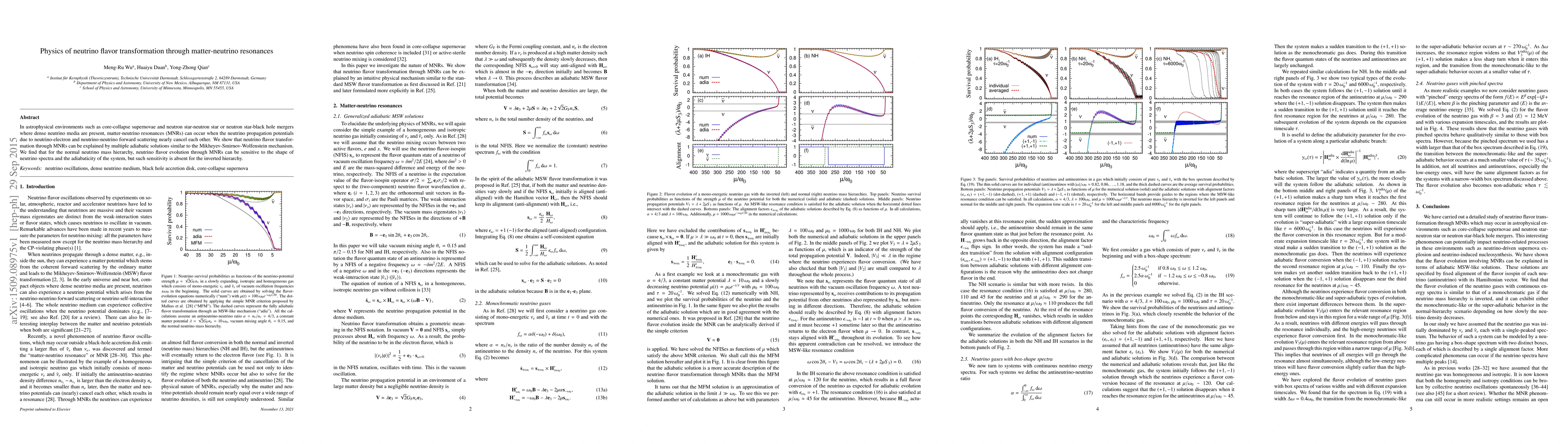 In astrophysical environments such as core-collapse supernovae and neutron star-neutron star or neutron star-black hole mergers where dense neutrino media are present, matter-neutrino resonances (MNRs) can occur when the neutrino propagation potentials due to neutrino-electron and neutrino-neutrino forward scattering nearly cancel each other. We show that neutrino flavor transformation through MNRs can be explained by multiple adiabatic solutions similar to the Mikheyev-Smirnov-Wolfenstein mechanism. We find that for the normal neutrino mass hierarchy, neutrino flavor evolution through MNRs can be sensitive to the shape of neutrino spectra and the adiabaticity of the system, but such sensitivity is absent for the inverted hierarchy.