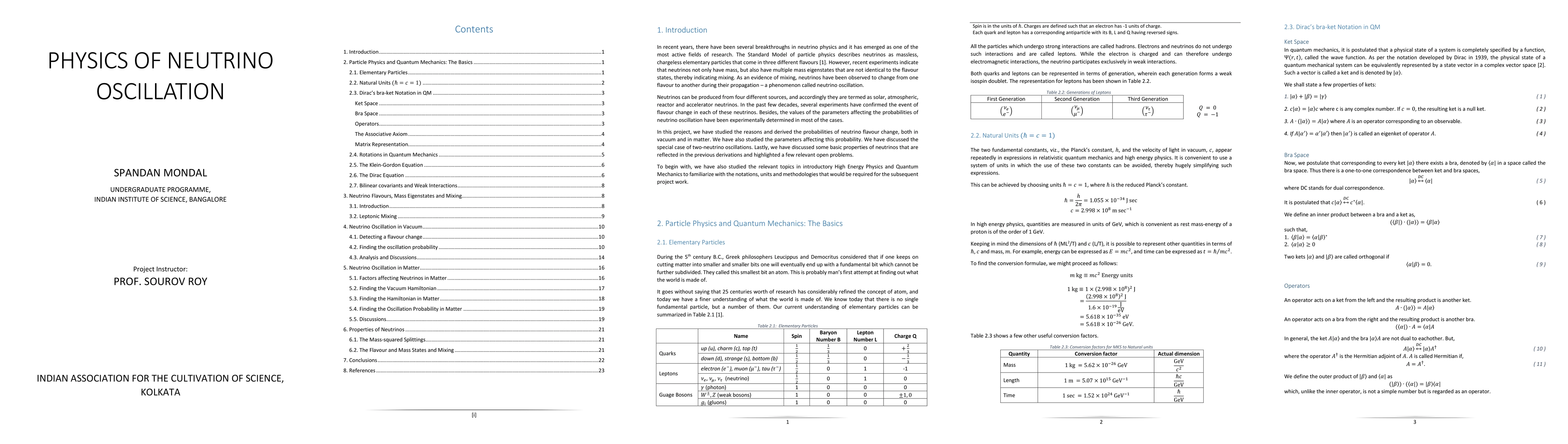 The Standard Model of particle physics describes neutrinos as massless, chargeless elementary particles that come in three different flavours. However, recent experiments indicate that neutrinos not only have mass, but also have multiple mass eigenstates that are not identical to the flavour states, thereby indicating mixing. As an evidence of mixing, neutrinos have been observed to change from one flavour to another during their propagation, a phenomenon called neutrino oscillation. We have studied the reasons and derived the probabilities of neutrino flavour change, both in vacuum and in matter. We have also studied the parameters affecting this probability. We have discussed the special case of two-neutrino oscillations. Lastly, we have discussed some basic properties of neutrinos that are reflected in the previous derivations and highlighted a few relevant open problems. To begin with, we have also studied the relevant topics in introductory High Energy Physics and Quantum Mechanics to familiarize with the notations, units and methodologies that would be required for the subsequent topics.