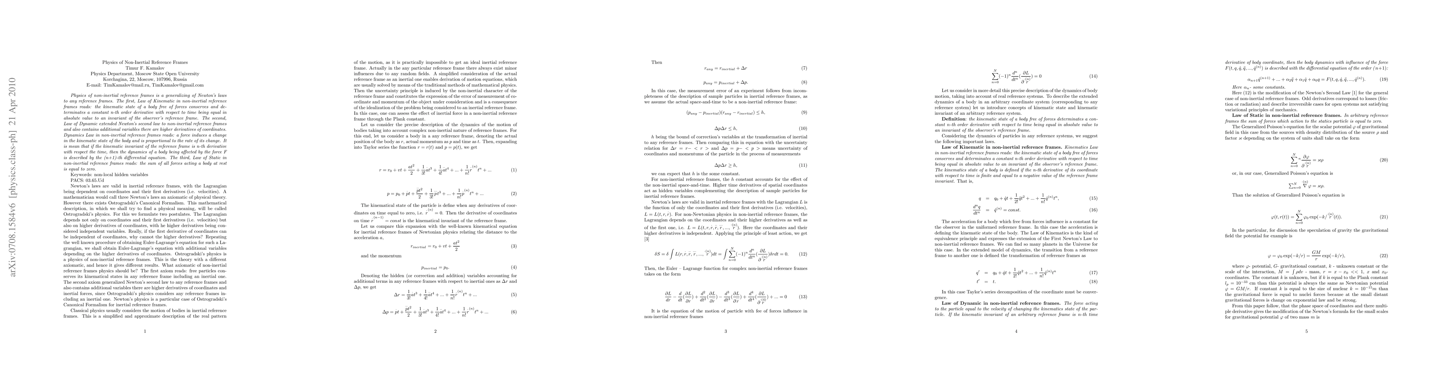 This paper explores the physics of non-inertial reference frames, extending Newton's laws to such frames. It introduces three laws: kinematic, dynamic, and static, each describing the behavior of bodies under forces in non-inertial contexts, including higher-order derivatives and additional variables.