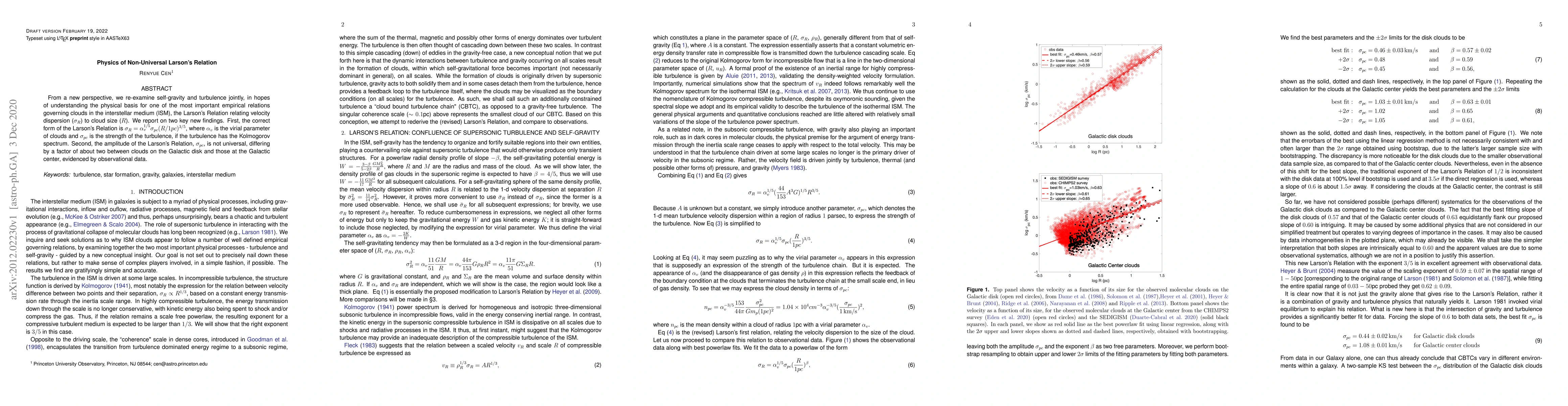 From a new perspective, we re-examine self-gravity and turbulence jointly, in hopes of understanding the physical basis for one of the most important empirical relations governing clouds in the interstellar medium (ISM), the Larson's Relation relating velocity dispersion ($\sigma_R$) to cloud size ($R$). We report on two key new findings. First, the correct form of the Larson's Relation is $\sigma_R=\alpha_v^{1/5}\sigma_{pc}(R/1pc)^{3/5}$, where $\alpha_v$ is the virial parameter of clouds and $\sigma_{pc}$ is the strength of the turbulence, if the turbulence has the Kolmogorov spectrum. Second, the amplitude of the Larson's Relation, $\sigma_{pc}$, is not universal, differing by a factor of about two between clouds on the Galactic disk and those at the Galactic center, evidenced by observational data.