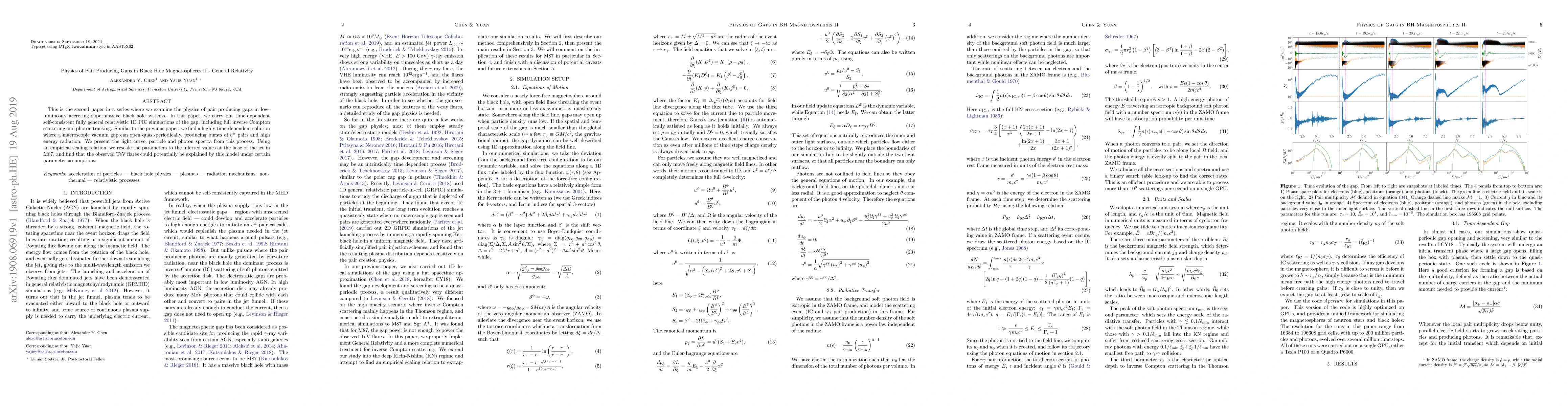 This paper conducts time-dependent, fully general relativistic 1D PIC simulations to study pair-producing gaps in black hole magnetospheres, revealing quasi-periodic vacuum gaps that generate $e^\pm$ pairs and high-energy radiation. The model's parameters are rescaled to suggest that M87's TeV flares may be explained by this mechanism.