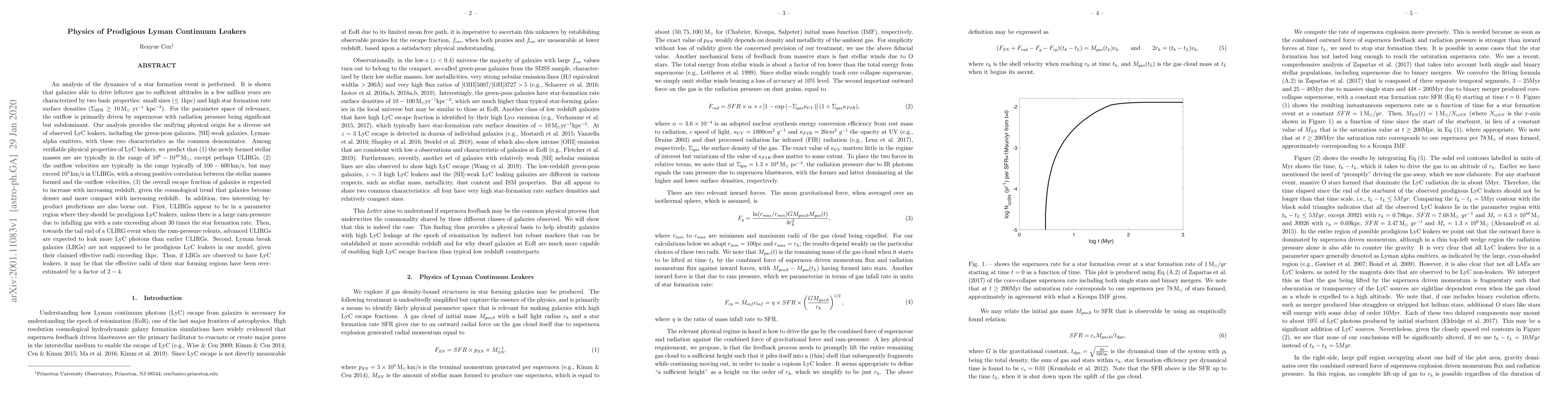 This paper analyzes the dynamics of star formation events in galaxies, identifying small size and high star formation rate as key properties for prodigious Lyman Continuum (LyC) leakers. The study predicts that these galaxies typically have newly formed stellar masses between 1e8-1e10 Msun and outflow velocities of 100-600 km/s, with a positive correlation between stellar mass and outflow velocity.