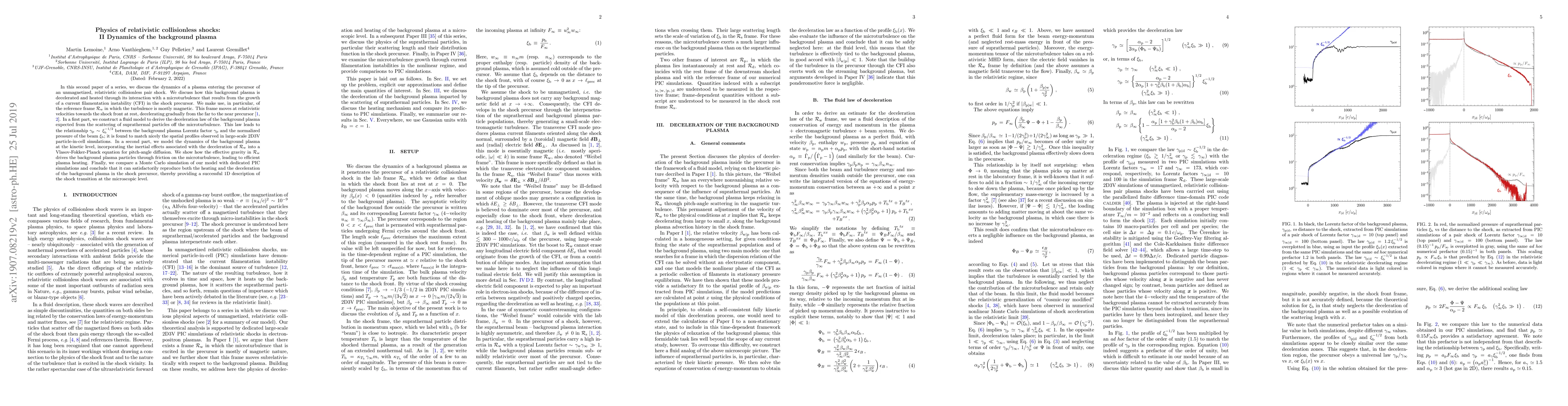 In this second paper of a series, we discuss the dynamics of a plasma entering the precursor of an unmagnetized, relativistic collisionless pair shock. We discuss how this background plasma is decelerated and heated through its interaction with a microturbulence that results from the growth of a current filamentation instability (CFI) in the shock precursor. We make use, in particular, of the reference frame $\mathcal R_{\rm w}$ in which the turbulence is mostly magnetic. This frame moves at relativistic velocities towards the shock front at rest, decelerating gradually from the far to the near precursor. In a first part, we construct a fluid model to derive the deceleration law of the background plasma expected from the scattering of suprathermal particles off the microturbulence. This law leads to the relationship $\gamma_{\rm p}\,\sim\,\xi_{\rm b}^{-1/2}$ between the background plasma Lorentz factor $\gamma_{\rm p}$ and the normalized pressure of the beam $\xi_{\rm b}$; it is found to match nicely the spatial profiles observed in large-scale 2D3V particle-in-cell simulations. In a second part, we model the dynamics of the background plasma at the kinetic level, incorporating the inertial effects associated with the deceleration of $\mathcal R_{\rm w}$ into a Vlasov-Fokker-Planck equation for pitch-angle diffusion. We show how the effective gravity in $\mathcal R_{\rm w}$ drives the background plasma particles through friction on the microturbulence, leading to efficient plasma heating. Finally, we compare a Monte Carlo simulation of our model with dedicated PIC simulations and conclude that it can satisfactorily reproduce both the heating and the deceleration of the background plasma in the shock precursor, thereby providing a successful 1D description of the shock transition at the microscopic level.