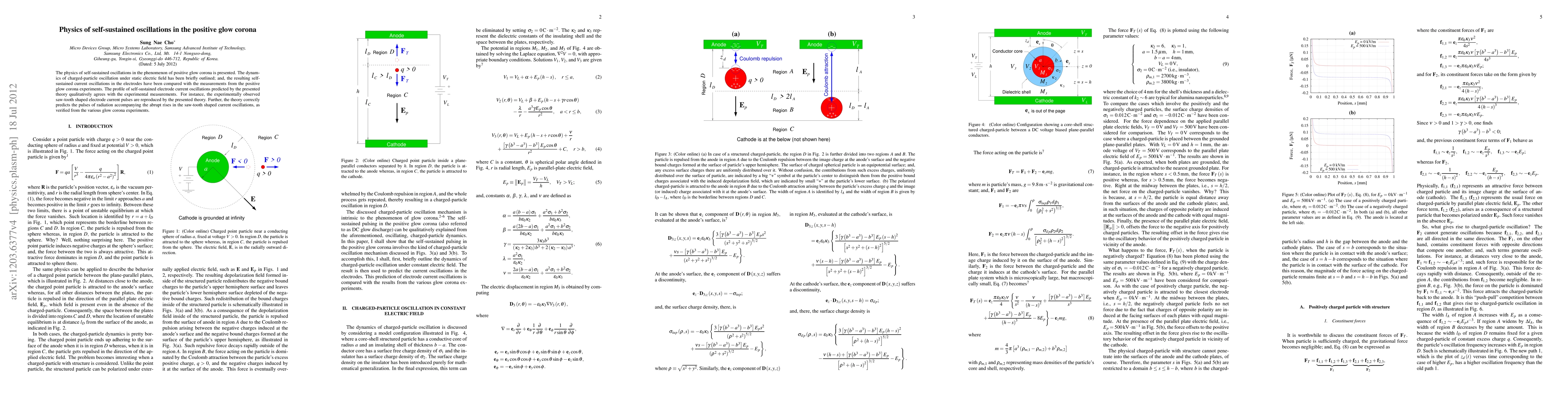 The physics of self-sustained oscillations in the phenomenon of positive glow corona is presented. The dynamics of charged-particle oscillation under static electric field has been briefly outlined; and, the resulting self-sustained current oscillations in the electrodes have been compared with the measurements from the positive glow corona experiments. The profile of self-sustained electrode current oscillations predicted by the presented theory qualitatively agrees with the experimental measurements. For instance, the experimentally observed saw-tooth shaped electrode current pulses are reproduced by the presented theory. Further, the theory correctly predicts the pulses of radiation accompanying the abrupt rises in the saw-tooth shaped current oscillations, as verified from the various glow corona experiments.