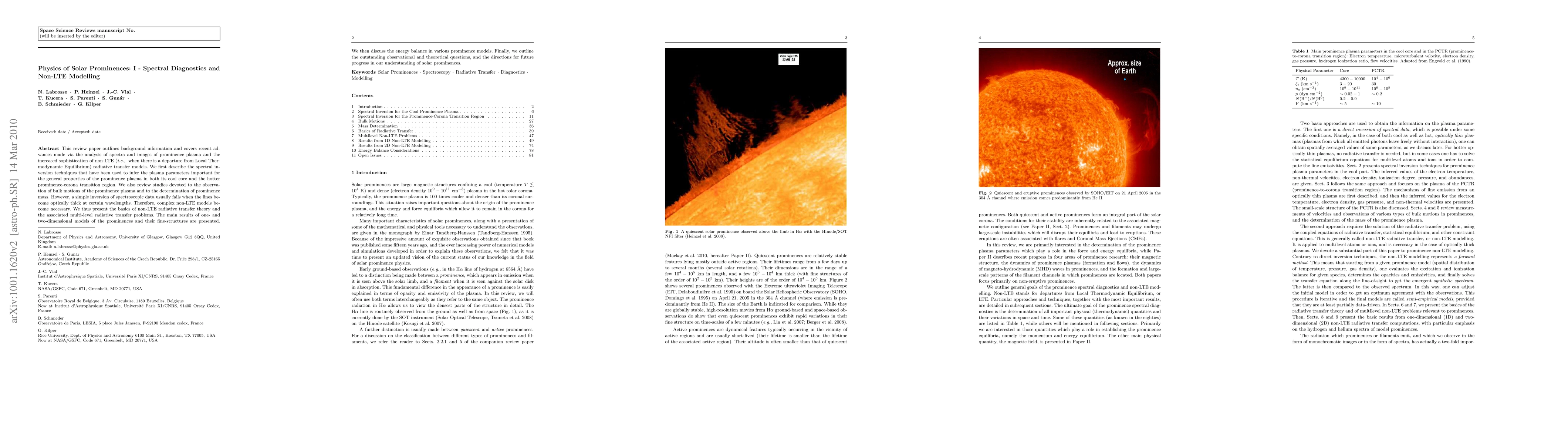 This review paper outlines background information and covers recent advances made via the analysis of spectra and images of prominence plasma and the increased sophistication of non-LTE (ie when there is a departure from Local Thermodynamic Equilibrium) radiative transfer models. We first describe the spectral inversion techniques that have been used to infer the plasma parameters important for the general properties of the prominence plasma in both its cool core and the hotter prominence-corona transition region. We also review studies devoted to the observation of bulk motions of the prominence plasma and to the determination of prominence mass. However, a simple inversion of spectroscopic data usually fails when the lines become optically thick at certain wavelengths. Therefore, complex non-LTE models become necessary. We thus present the basics of non-LTE radiative transfer theory and the associated multi-level radiative transfer problems. The main results of one- and two-dimensional models of the prominences and their fine-structures are presented. We then discuss the energy balance in various prominence models. Finally, we outline the outstanding observational and theoretical questions, and the directions for future progress in our understanding of solar prominences.