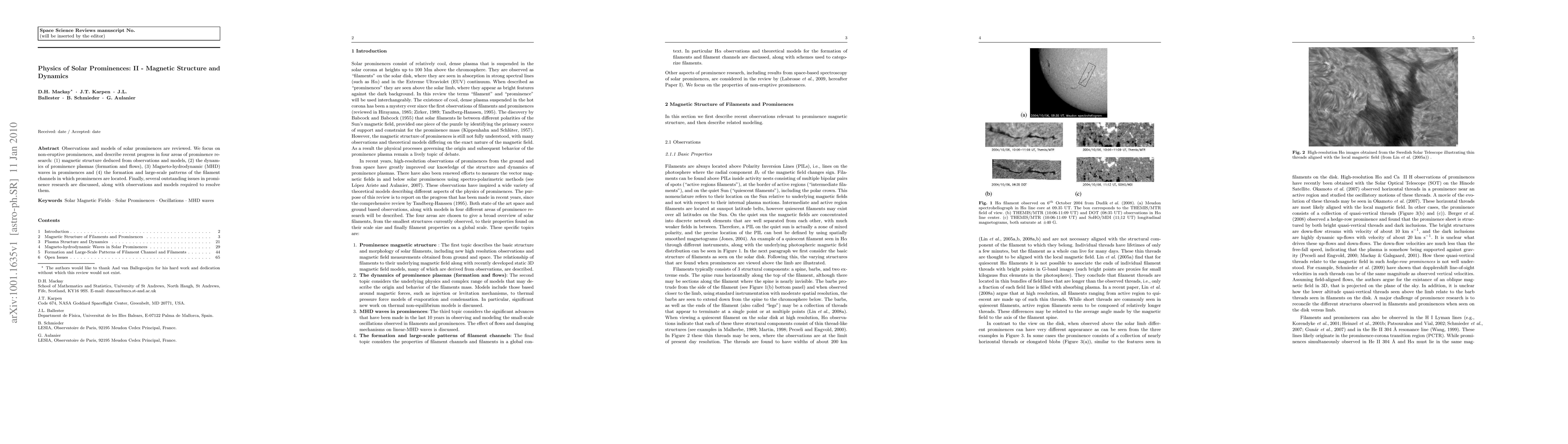 This paper reviews recent advancements in solar prominence research, focusing on non-eruptive prominences, and examines magnetic structure, plasma dynamics, MHD waves, and the formation of filament channels. It also highlights unresolved issues and necessary future observations and models.