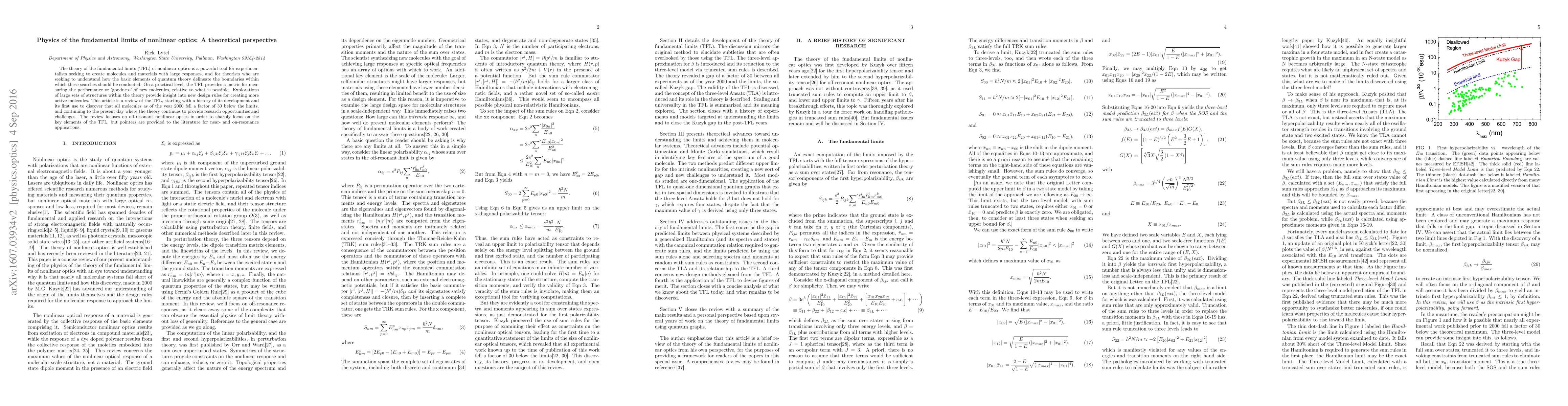 This paper reviews the theory of fundamental limits (TFL) in nonlinear optics, which provides a metric to measure the performance of new molecules and design rules for creating more active materials. The TFL was found to be a factor of 30 below the responses of all molecules as of 2000.
