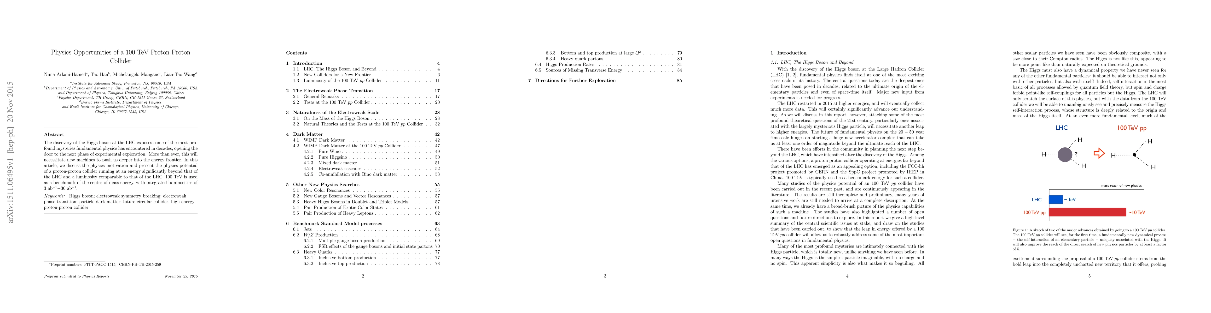 This paper explores the physics potential of a 100 TeV proton-proton collider, aiming to extend the energy frontier beyond the Large Hadron Collider (LHC) and investigate phenomena such as supersymmetry and dark matter. It highlights the collider's capability to provide integrated luminosities from 3 to 30 inverse ab.