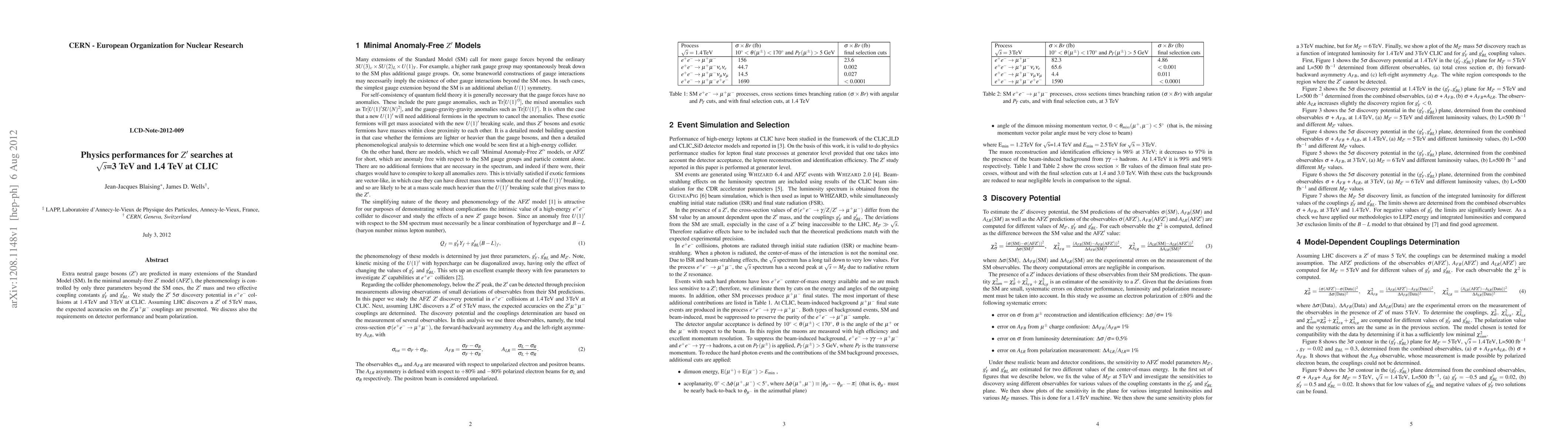 This paper explores the physics performances for Z' searches at 3 TeV and 1.5 TeV CLIC, discussing discovery potential and accuracy in e+e- collisions.
