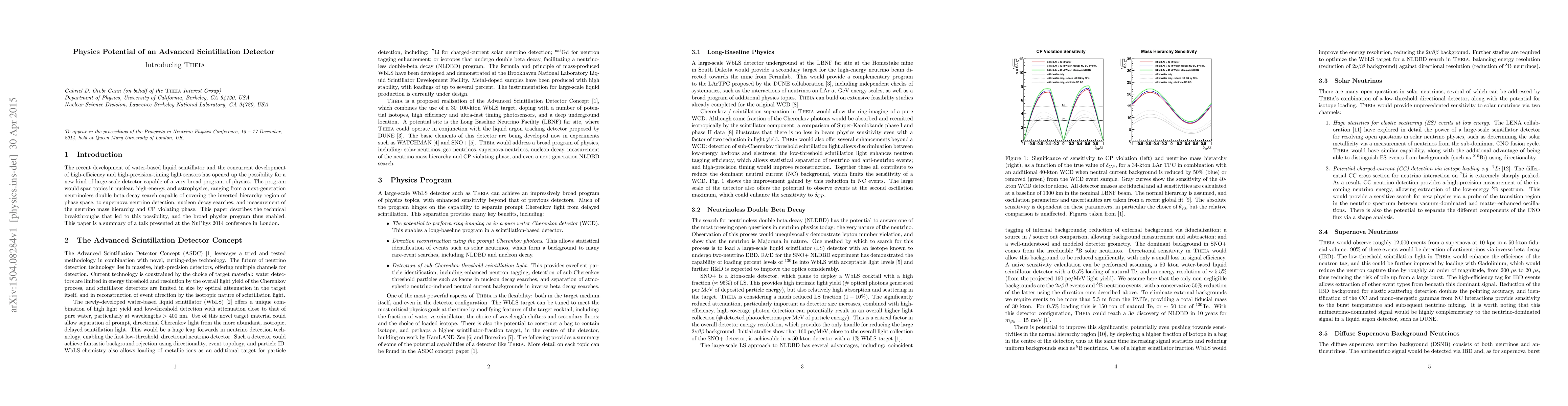 A new detector called THEIA has been developed to explore physics topics in nuclear, high-energy, and astrophysics, including neutrino detection and decay searches, with improved sensitivity enabled by advanced scintillation and timing technology.