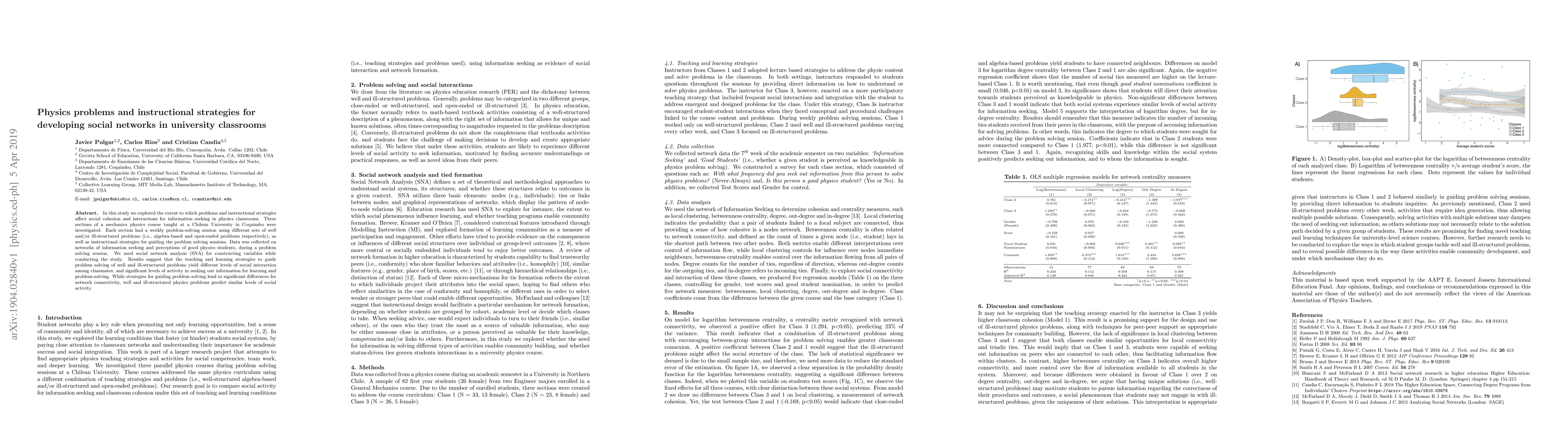 In this study, we explored the extent to which problems and instructional strategies affect social cohesion and interactions for information seeking in physics classrooms. Three sections of a mechanics physics course taught at a Chilean University in Coquimbo were investigated. Each section had a weekly problem-solving session using different sets of well and/or ill-structured problems (i.e., algebra-based and open-ended problems respectively), as well as instructional strategies for guiding the problem-solving sessions. Data was collected on networks of information seeking and perceptions of good physics students, during a problem-solving session. We used social network analysis (SNA) for constructing variables while conducting the study. Results suggest that the teaching and learning strategies to guide problem-solving of well and ill-structured problems yield different levels of social interaction among classmates, and significant levels of activity in seeking out information for learning and problem-solving. While strategies for guiding problem-solving lend to significant differences for network connectivity, well and ill-structured physics problems predict similar levels of social activity.