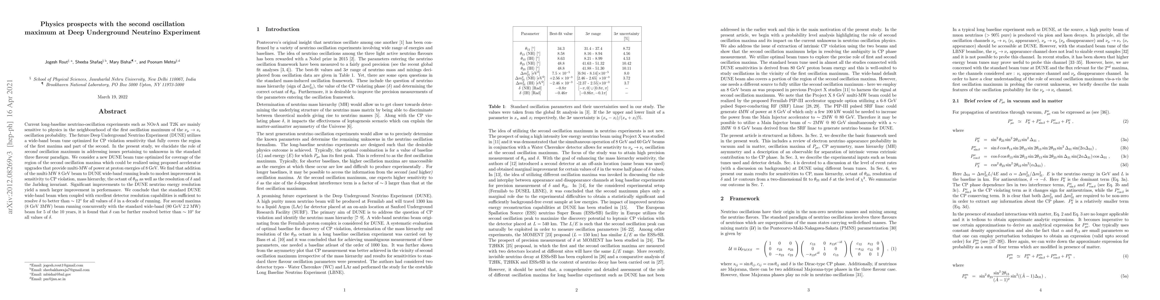 Current long-baseline neutrino-oscillation experiments such as NO$\nu$A and T2K are mainly sensitive to physics in the neighbourhood of the first oscillation maximum of the $\nu_\mu \to \nu_e$ oscillation probability. The future Deep Underground Neutrino Experiment (DUNE) utilizes a wide-band beam tune optimized for CP violation sensitivity that fully covers the region of the first maxima and part of the second. In the present study, we elucidate the role of second oscillation maximum in addressing issues pertaining to unknowns in the standard three flavour paradigm. We consider a new DUNE beam tune optimized for coverage of the region of the second oscillation maxima which could be realized using proposed accelerator upgrades that provide multi-MW of power at proton energies of 8 GeV. We find that addition of the multi-MW 8 GeV beam to DUNE wide-band running leads to modest improvement in sensitivity to CP violation, mass hierarchy, the octant of $\theta_{23}$ as well as the resolution of $\delta$ and the Jarlskog invariant. Significant improvements to the DUNE neutrino energy resolution yield a much larger improvement in performance. We conclude that the standard DUNE wide-band beam when coupled with excellent detector resolution capabilities is sufficient to resolve $\delta$ to better than $\sim 12^\circ$ for all values of $\delta$ in a decade of running. For second maxima (8 GeV 3MW) beam running concurrently with the standard wide-band (80 GeV 2.2 MW) beam for 5 of the 10 years, it is found that $\delta$ can be further resolved better than $\sim 10^\circ$ for all values of $\delta$.
