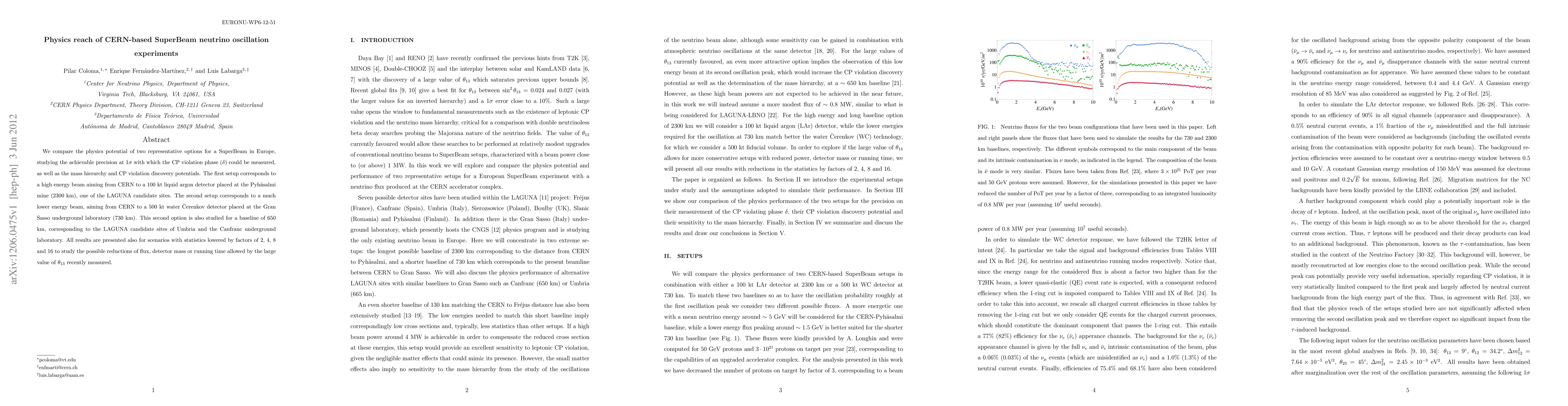 We compare the physics potential of two representative options for a SuperBeam in Europe, studying the achievable precision at 1\sigma with which the CP violation phase (\delta) could be measured, as well as the mass hierarchy and CP violation discovery potentials. The first setup corresponds to a high energy beam aiming from CERN to a 100 kt liquid argon detector placed at the Pyh\"asalmi mine (2300 km), one of the LAGUNA candidate sites. The second setup corresponds to a much lower energy beam, aiming from CERN to a 500 kt water \v{C}erenkov detector placed at the Gran Sasso underground laboratory (730 km). This second option is also studied for a baseline of 650 km, corresponding to the LAGUNA candidate sites of Umbria and the Canfranc underground laboratory. All results are presented also for scenarios with statistics lowered by factors of 2, 4, 8 and 16 to study the possible reductions of flux, detector mass or running time allowed by the large value of \theta_{13} recently measured.