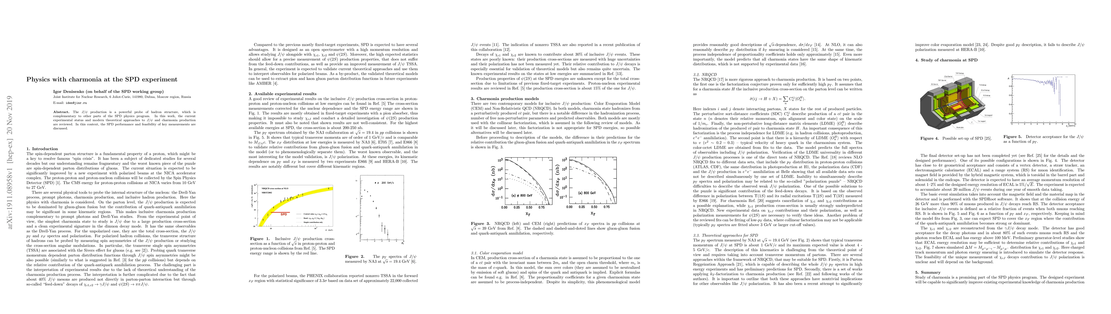 This paper reviews current research on J/psi production, a powerful probe of hadron structure, and discusses the experimental status and feasibility of key measurements at the SPD experiment. It highlights the importance of charmonia production as a complementary tool to other parts of the SPD physics program.