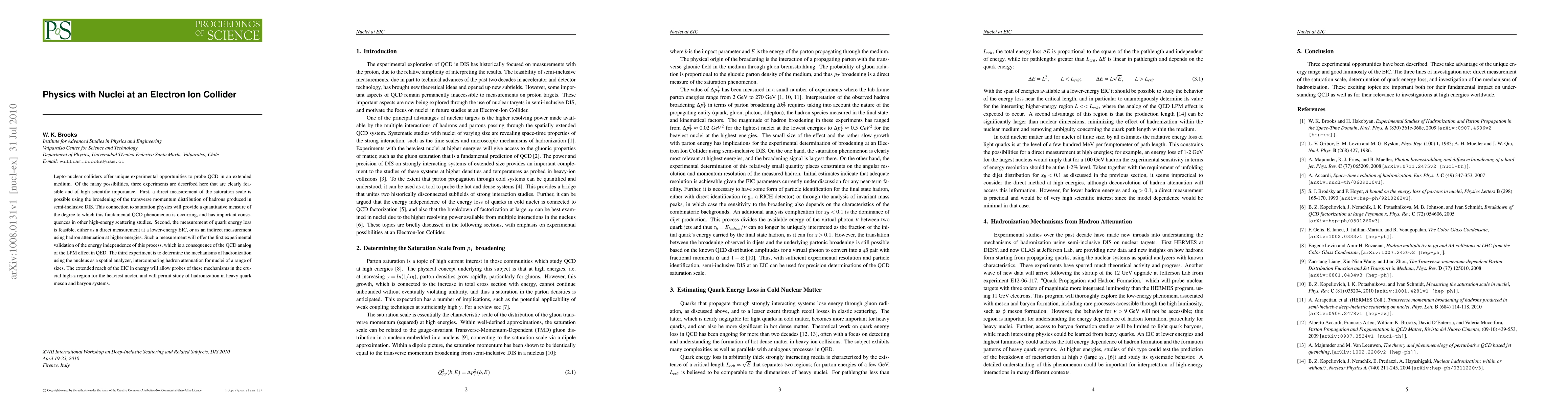 Lepto-nuclear colliders offer unique experimental opportunities to probe QCD in an extended medium. Of the many possibilities, three experiments are described here that are clearly feasible and of high scientific importance. First, a direct measurement of the saturation scale is possible using the broadening of the transverse momentum distribution of hadrons produced in semi-inclusive DIS. This connection to saturation physics will provide a quantitative measure of the degree to which this fundamental QCD phenomenon is occurring, and has important consequences in other high-energy scattering studies. Second, the measurement of quark energy loss is feasible, either as a direct measurement at a lower-energy EIC, or as an indirect measurement using hadron attenuation at higher energies. Such a measurement will offer the first experimental validation of the energy independence of this process, which is a consequence of the QCD analog of the LPM effect in QED. The third experiment is to determine the mechanisms of hadronization using the nucleus as a spatial analyzer, intercomparing hadron attenuation for nuclei of a range of sizes. The extended reach of the EIC in energy will allow probes of these mechanisms in the crucial high-z region for the heaviest nuclei, and will permit study of hadronization in heavy quark meson and baryon systems.