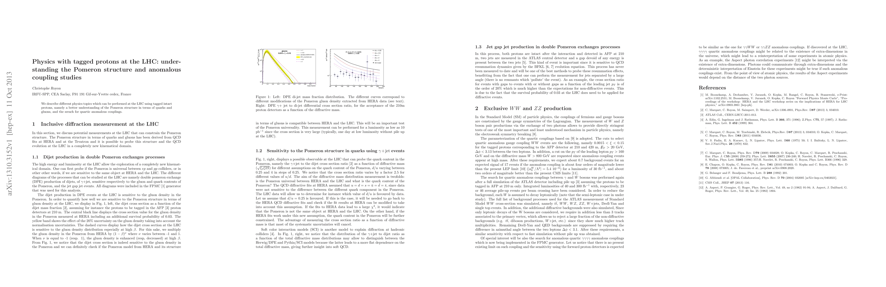 Summary: This paper explores the potential of tagged intact protons at the LHC to enhance our understanding of the Pomeron's structure through quark and gluon analysis, and to investigate quartic anomalous couplings.