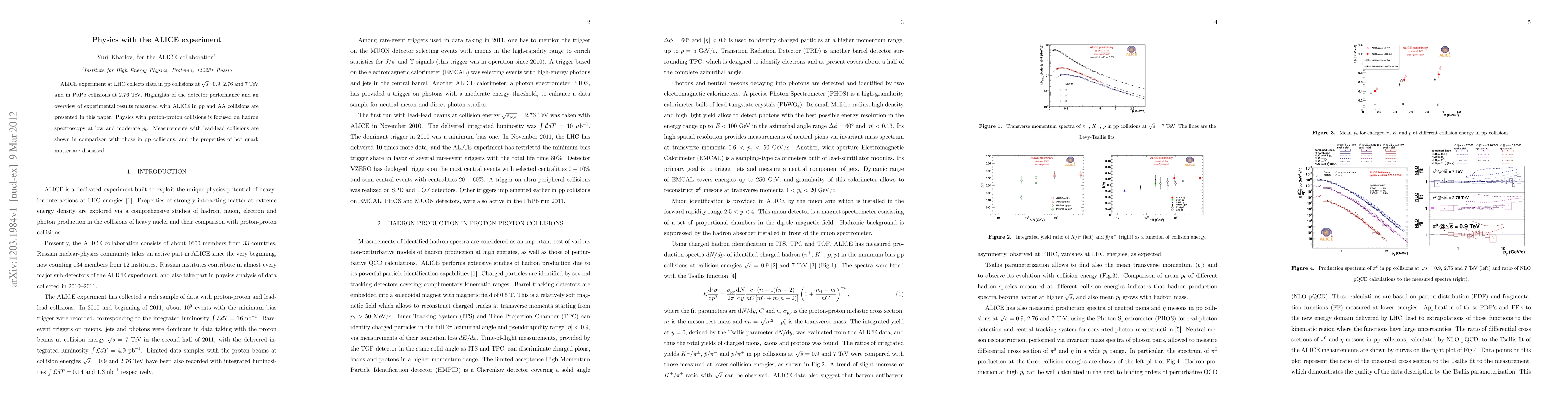 This paper summarizes the ALICE experiment at LHC, focusing on data from proton-proton and lead-lead collisions at various energies. It highlights detector performance and discusses hadron spectroscopy in pp collisions and the properties of hot quark matter in PbPb collisions.
