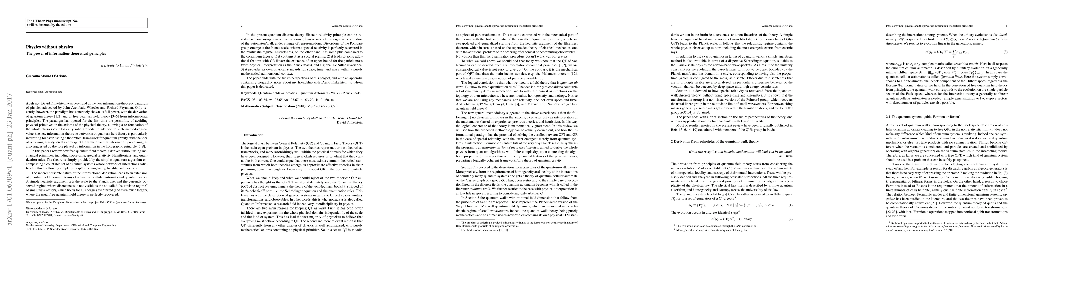 David Finkelstein was very fond of the new information-theoretic paradigm of physics advocated by John Archibald Wheeler and Richard Feynman. Only recently, however, the paradigm has concretely shown its full power, with the derivation of quantum theory (Chiribella et al., Phys. Rev. A 84:012311, 2011; D'Ariano et al., 2017) and of free quantum field theory (D'Ariano and Perinotti, Phys. Rev. A 90:062106, 2014; Bisio et al., Phys. Rev. A 88:032301, 2013; Bisio et al., Ann. Phys. 354:244, 2015; Bisio et al., Ann. Phys. 368:177, 2016) from informational principles. The paradigm has opened for the first time the possibility of avoiding physical primitives in the axioms of the physical theory, allowing a refoundation of the whole physics over logically solid grounds. In addition to such methodological value, the new information-theoretic derivation of quantum field theory is particularly interesting for establishing a theoretical framework for quantum gravity, with the idea of obtaining gravity itself as emergent from the quantum information processing, as also suggested by the role played by information in the holographic principle (Susskind, J. Math. Phys. 36:6377, 1995; Bousso, Rev. Mod. Phys. 74:825, 2002). In this paper I review how free quantum field theory is derived without using mechanical primitives, including space-time, special relativity, Hamiltonians, and quantization rules. The theory is simply provided by the simplest quantum algorithm encompassing a countable set of quantum systems whose network of interactions satisfies the three following simple principles: homogeneity, locality, and isotropy. The inherent discrete nature of the informational derivation leads to an extension of quantum field theory in terms of a quantum cellular automata and quantum walks. A simple heuristic argument sets the scale to the Planck one, and the observed regime is that of small wavevectors ...