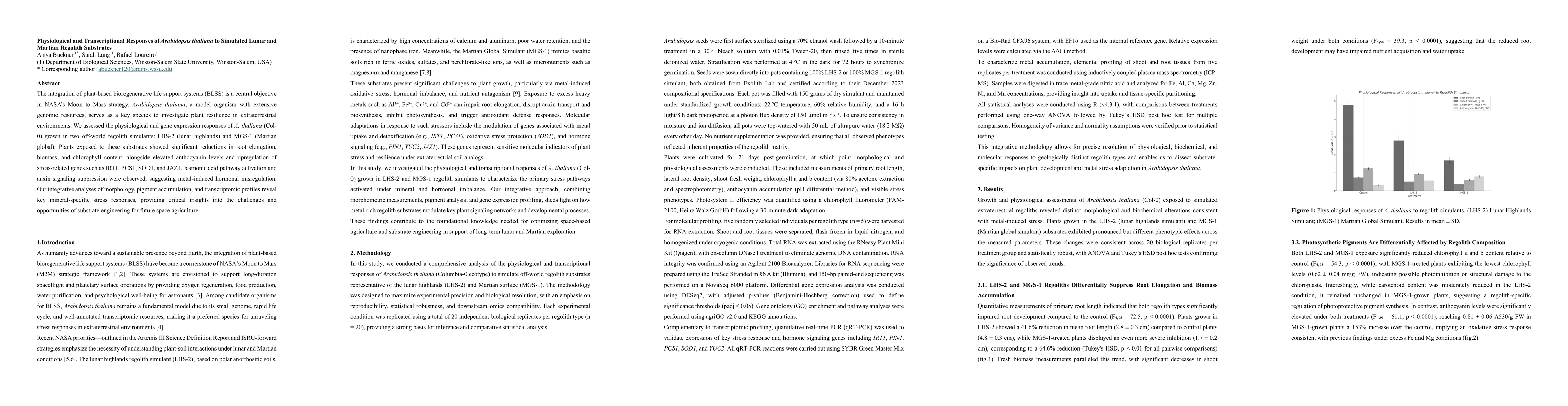 Arabidopsis thaliana plants grown in simulated lunar and Martian regolith substrates showed significant stress responses, including reduced growth, elevated anthocyanin levels, and altered gene expression.
