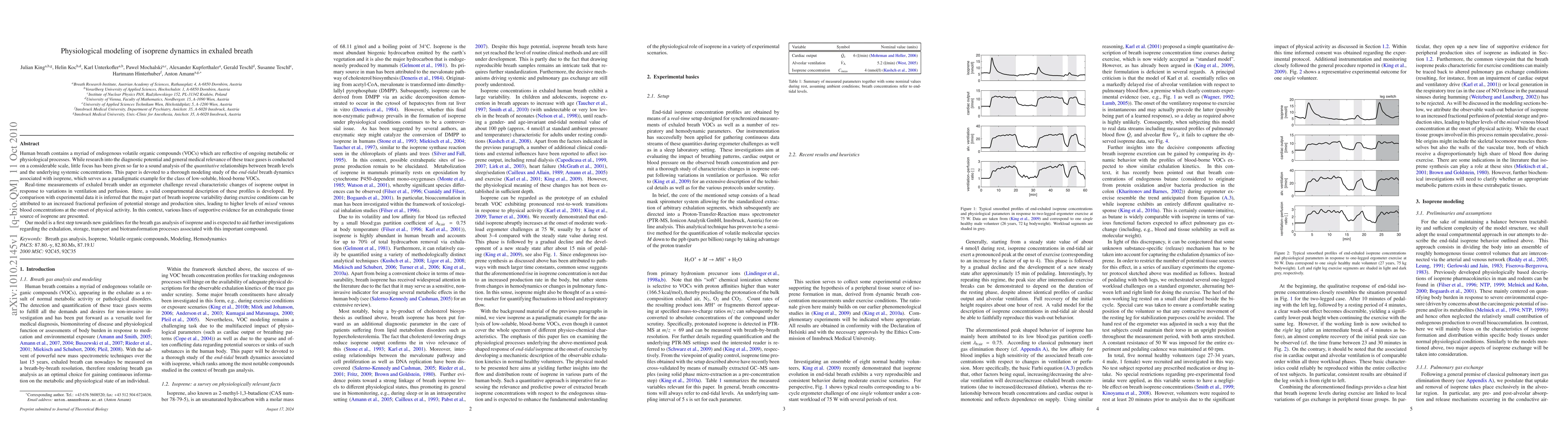 This paper develops a physiological model to analyze the dynamics of isoprene in exhaled breath, revealing that increased ventilation and perfusion during exercise significantly elevate isoprene levels. The study suggests an extrahepatic tissue source for isoprene and provides a foundation for future breath gas analysis guidelines.