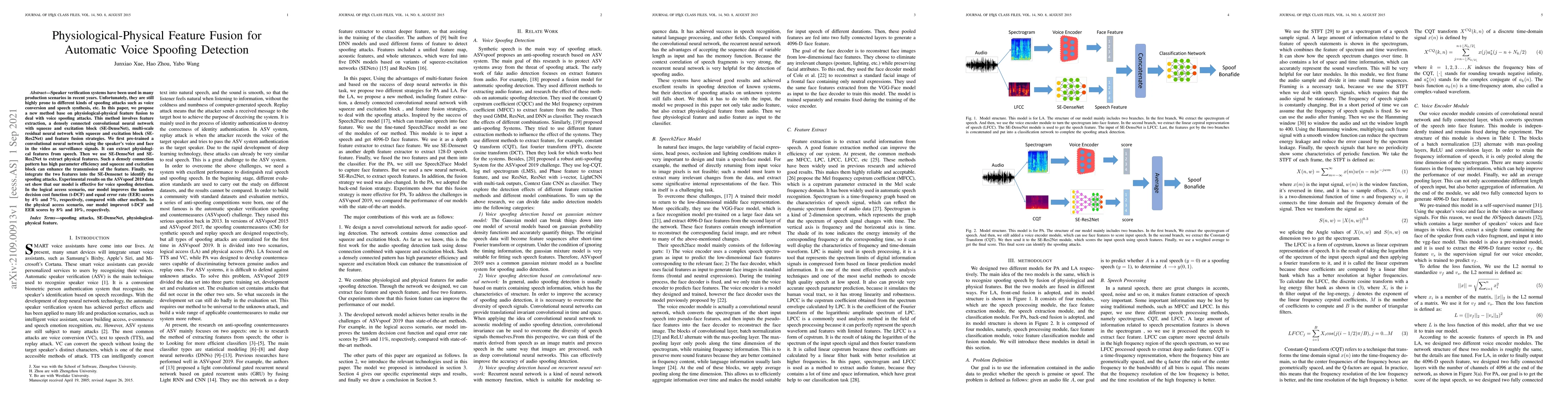 This paper proposes a novel method for automatic voice spoofing detection using physiological-physical feature fusion, employing SE-DenseNet and SE-Res2Net networks. The model shows significant improvements in tandem decision cost function and equal error rate metrics compared to other methods.