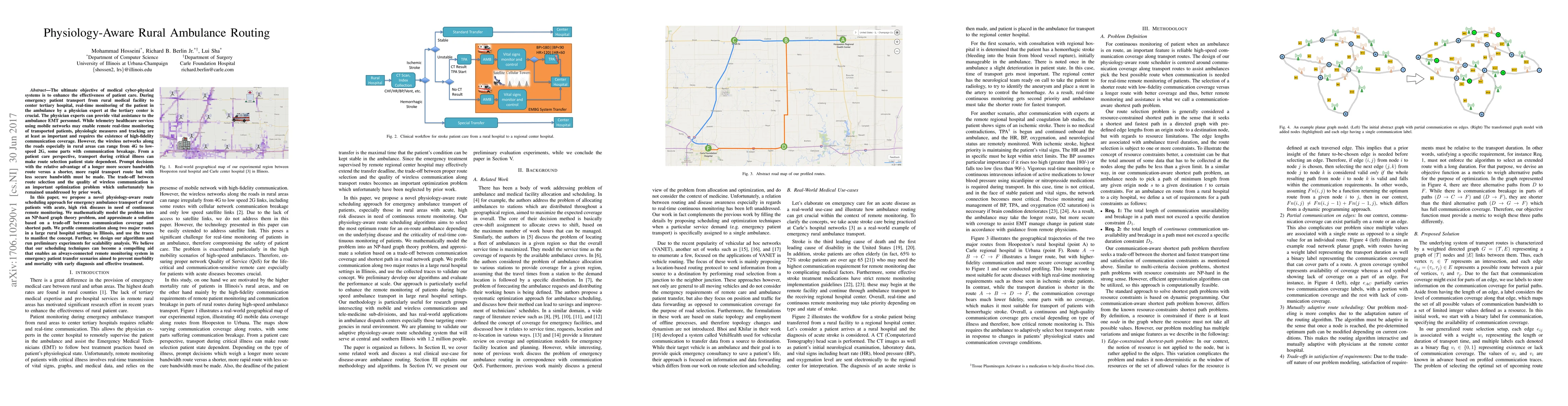 This paper proposes a physiology-aware ambulance routing system for rural emergencies, balancing communication coverage and shortest path. It models the problem as an NP-hard graph theory problem and tests algorithms in Illinois, aiming to ensure continuous remote monitoring and timely treatment, potentially reducing morbidity and mortality.