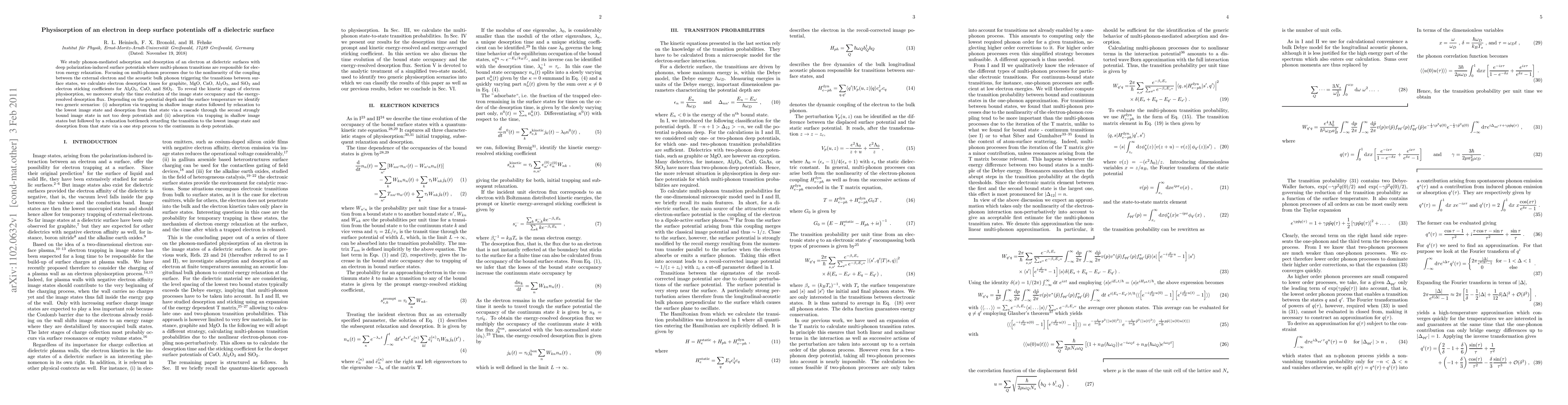 We study phonon-mediated adsorption and desorption of an electron at dielectric surfaces with deep polarization-induced surface potentials where multi-phonon transitions are responsible for electron energy relaxation. Focusing on multi-phonon processes due to the nonlinearity of the coupling between the external electron and the acoustic bulk phonon triggering the transitions between surface states, we calculate electron desorption times for graphite, MgO, CaO, (\text{Al}_2\text{O}_3), and (\text{SiO}_2) and electron sticking coefficients for (\text{Al}_2\text{O}_3), CaO, and (\text{SiO}_2). To reveal the kinetic stages of electron physisorption, we moreover study the time evolution of the image state occupancy and the energy-resolved desorption flux. Depending on the potential depth and the surface temperature we identify two generic scenarios: (i)adsorption via trapping in shallow image states followed by relaxation to the lowest image state and desorption from that state via a cascade through the second strongly bound image state in not too deep potentials and (ii)adsorption via trapping in shallow image states but followed by a relaxation bottleneck retarding the transition to the lowest image state and desorption from that state via a one step process to the continuum in deep potentials.