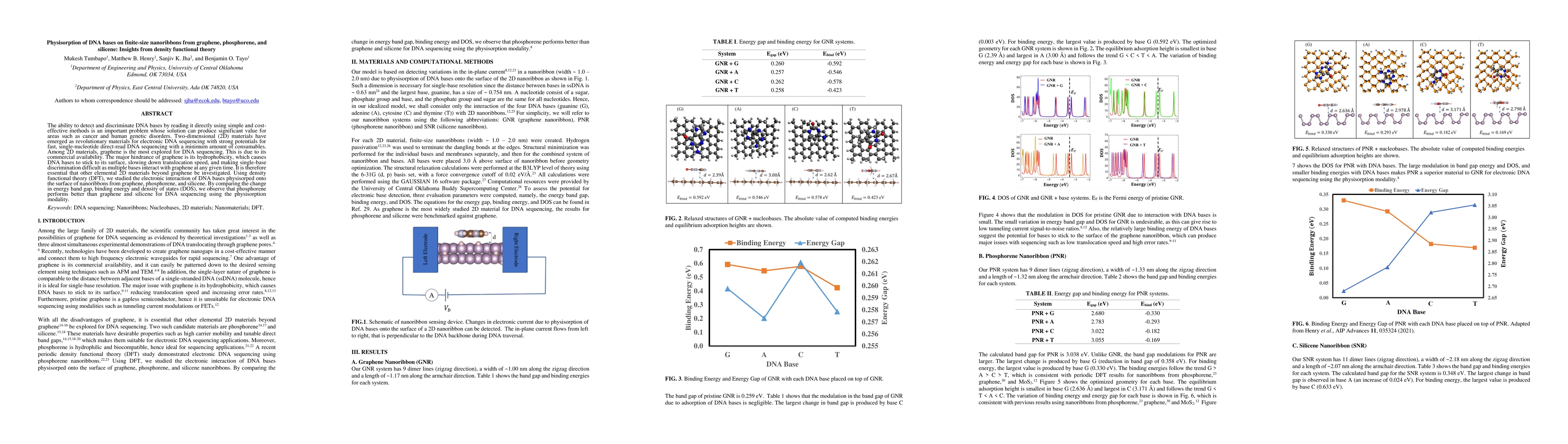 This study investigates the physisorption of DNA bases on nanoribbons from graphene, phosphorene, and silicene using density functional theory. Phosphorene is found to outperform graphene and silicene in terms of energy band gap change, binding energy, and density of states, indicating better potential for cost-effective, single-nucleotide direct-read DNA sequencing.